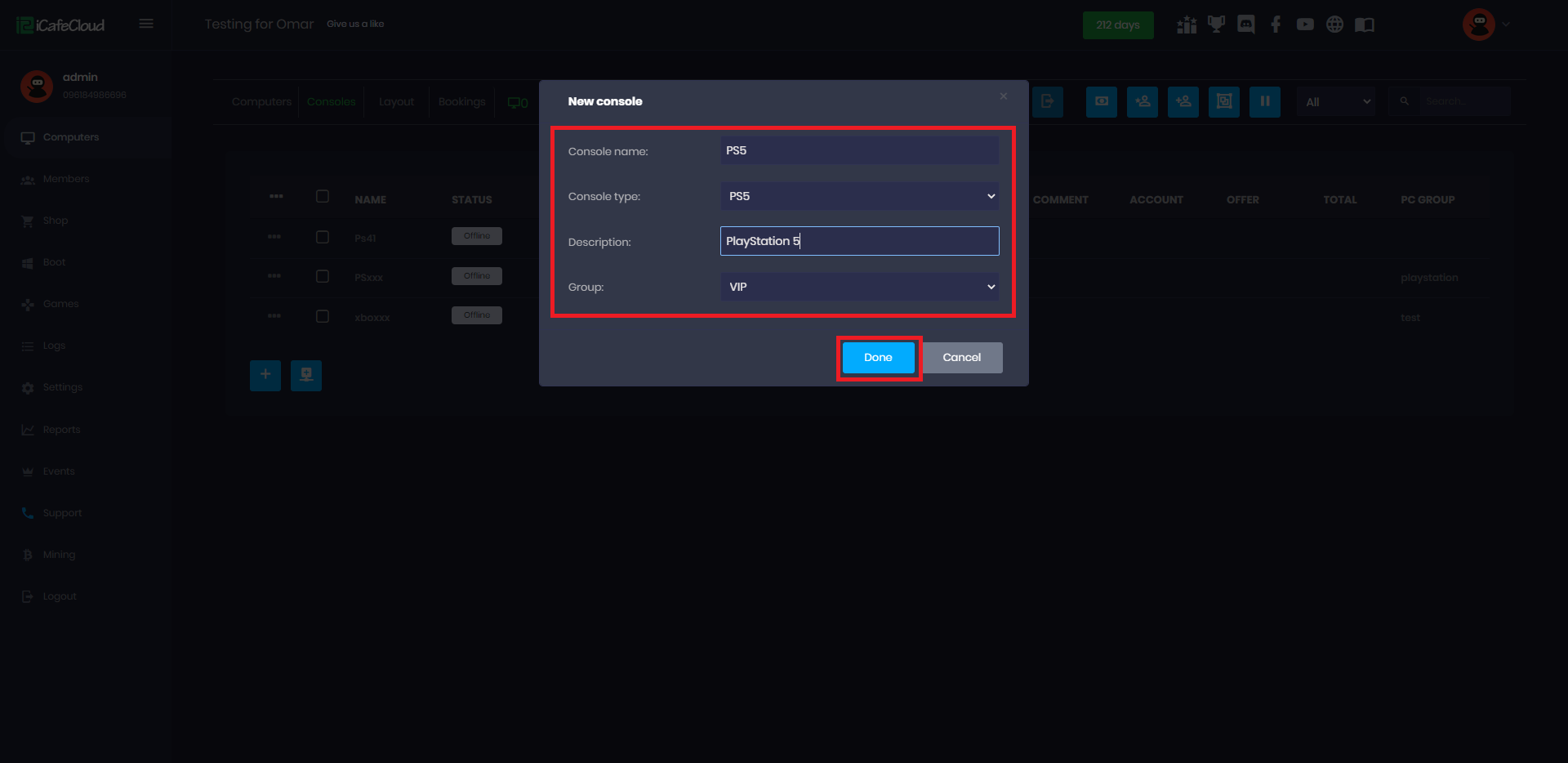 The "Consoles" tab on the PC page allows manual addition of consoles for time measurement. However, actual usage must be managed by staff, and offer switching is manual unless a SONOFF device is used.