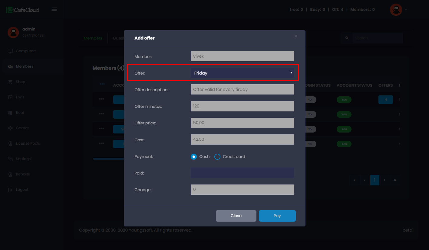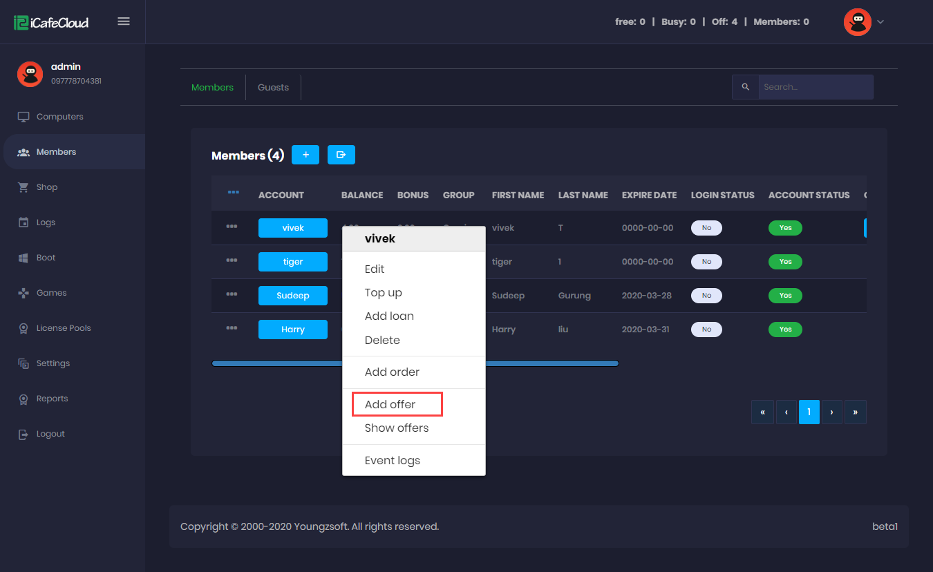 - Login to the iCafeCloud web admin and then click “Members”, then right click on the member, to which you want to add an offer, then choose “Add Offer” (Figure 1).