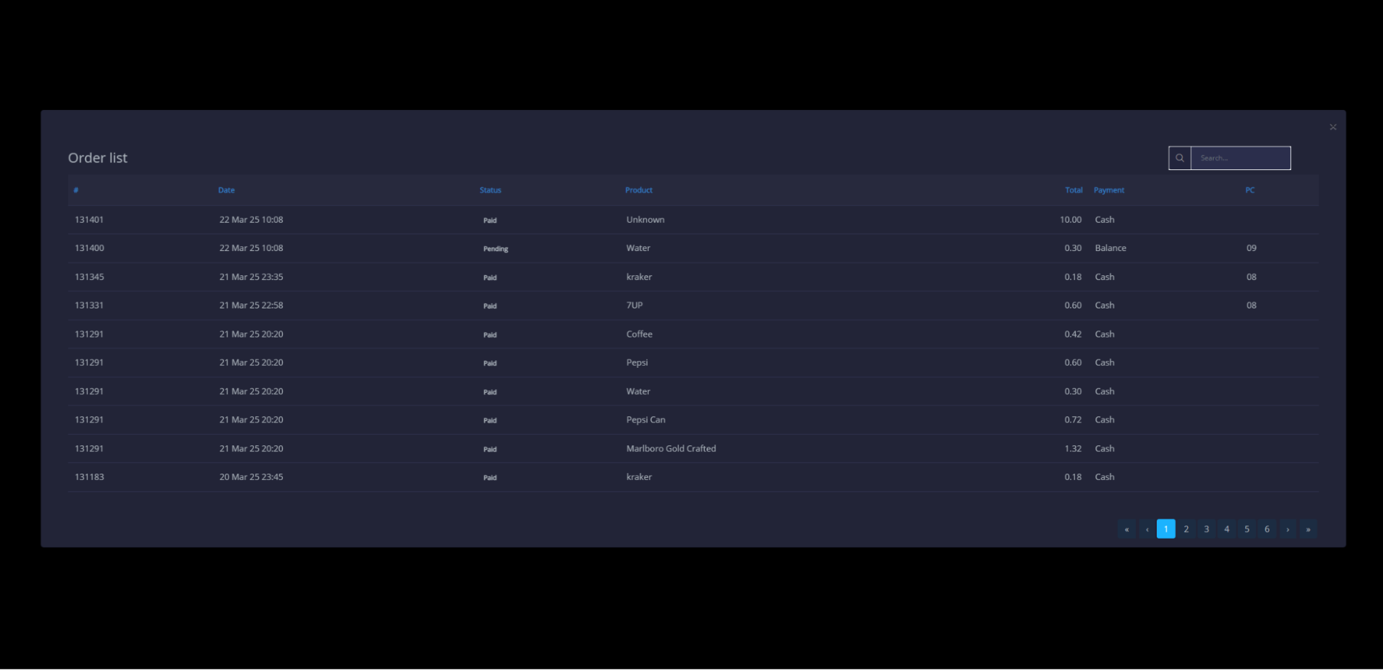 - Once the order list is opened, the client can see all their transactions with order ID, date and time, status (paid or pending), product, amount paid, payment method, and the pc used if applicable. (Figure 2)