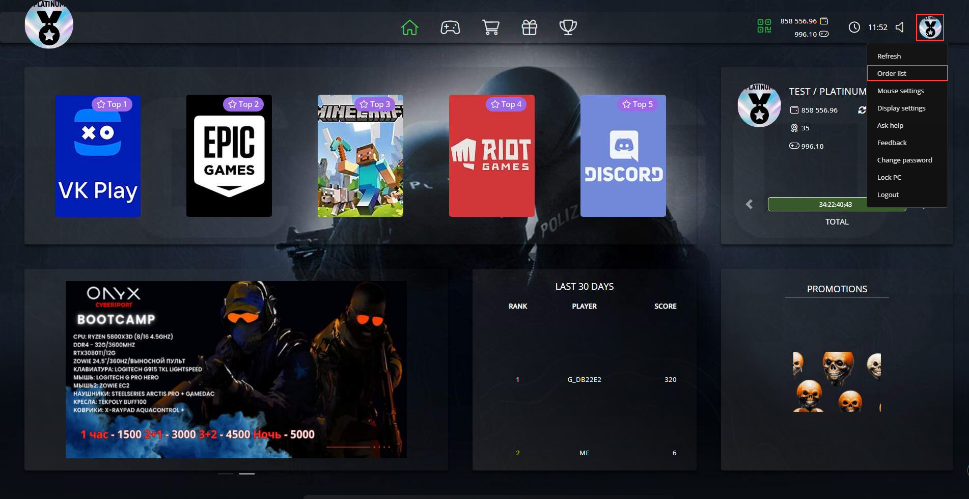 - Order list: A record displaying the complete history of purchases and top-ups for a client account, only members.