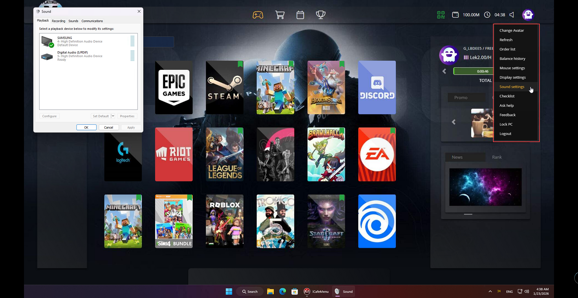 The following explains the main functionalities of the iCafeMenu interface, including the Home Page, Games Page, Shop Page, Event Page, how to switch the main menu after login, and how to view the Order List.