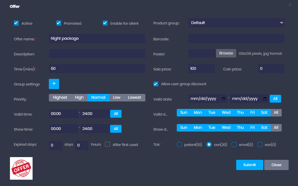- Show time : Show the offer at shop and client pc so that it can be purchased at selected hours. *