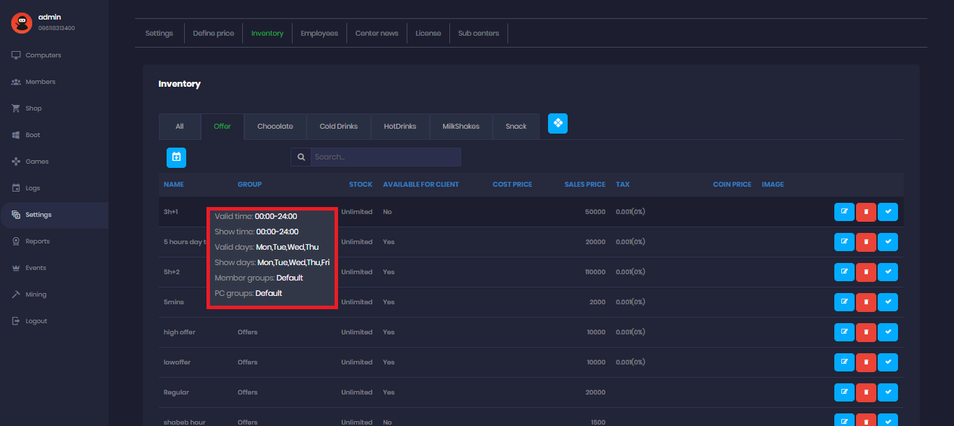 - To hide an offer from both the SHOP (admin panel) and the client, add an asterisk (*) before its name. Example: *Night Offer.