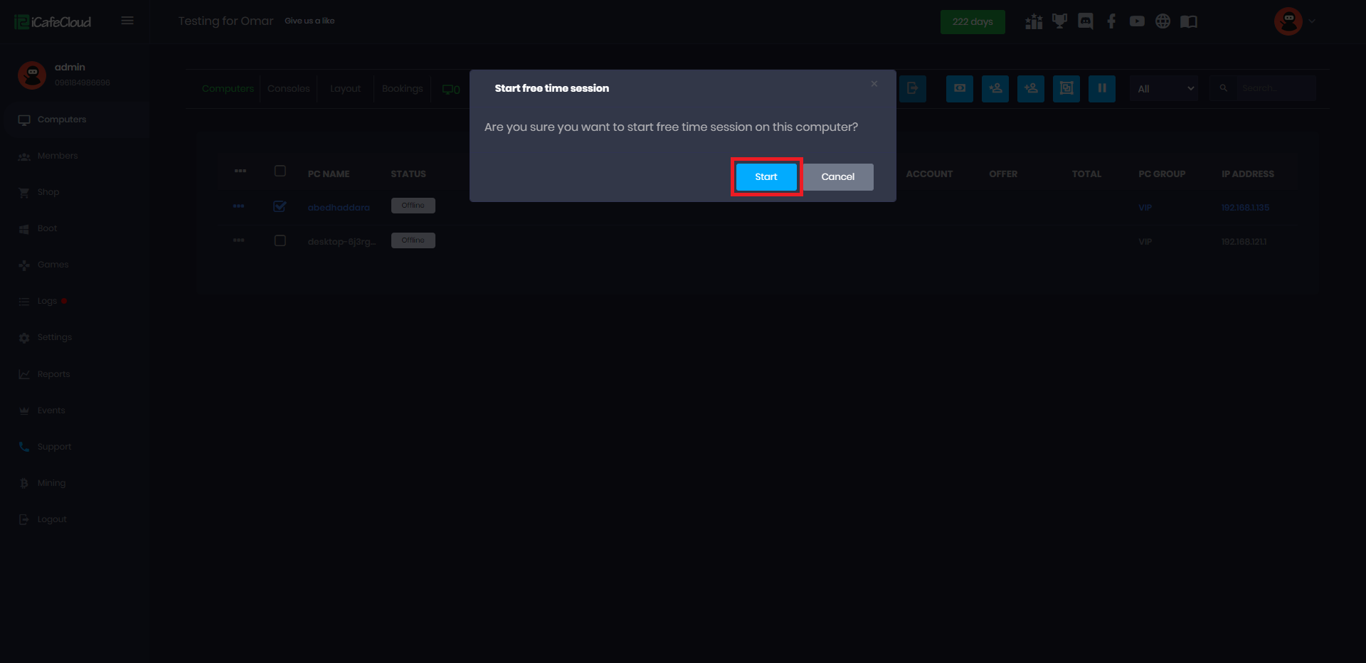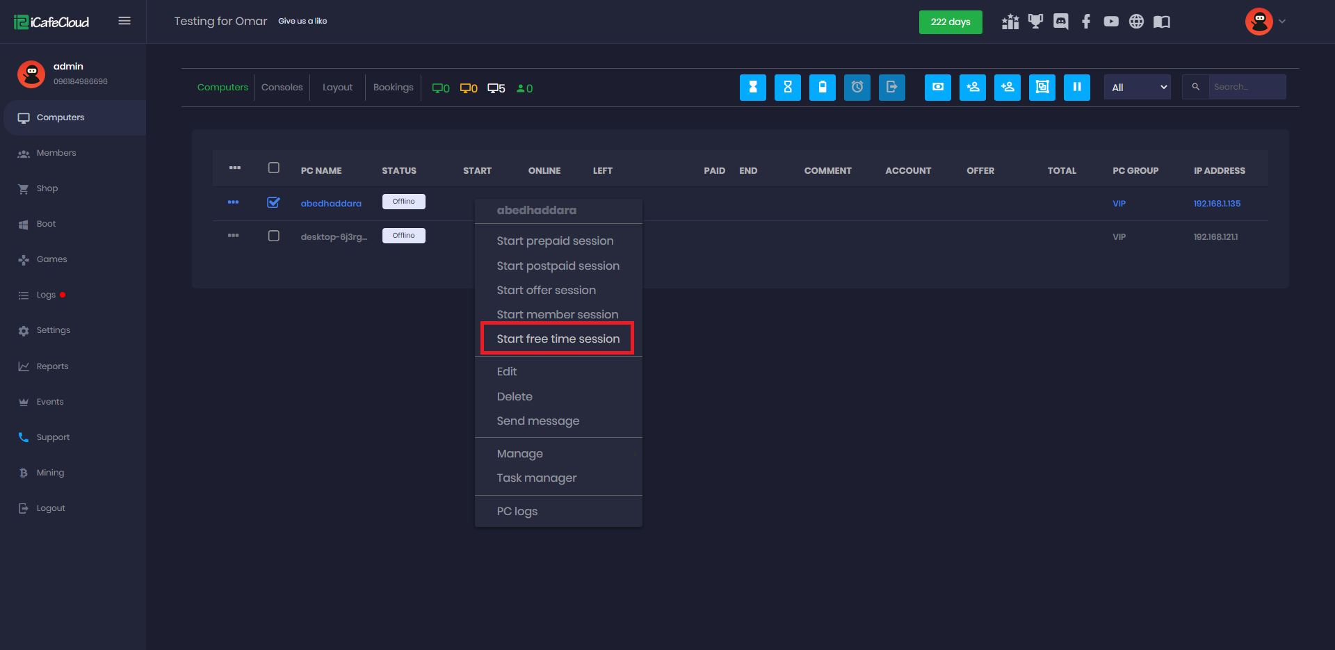 This section explains how admins or employees with permissions can start a "Free Time Session" from the iCafeCloud panel.