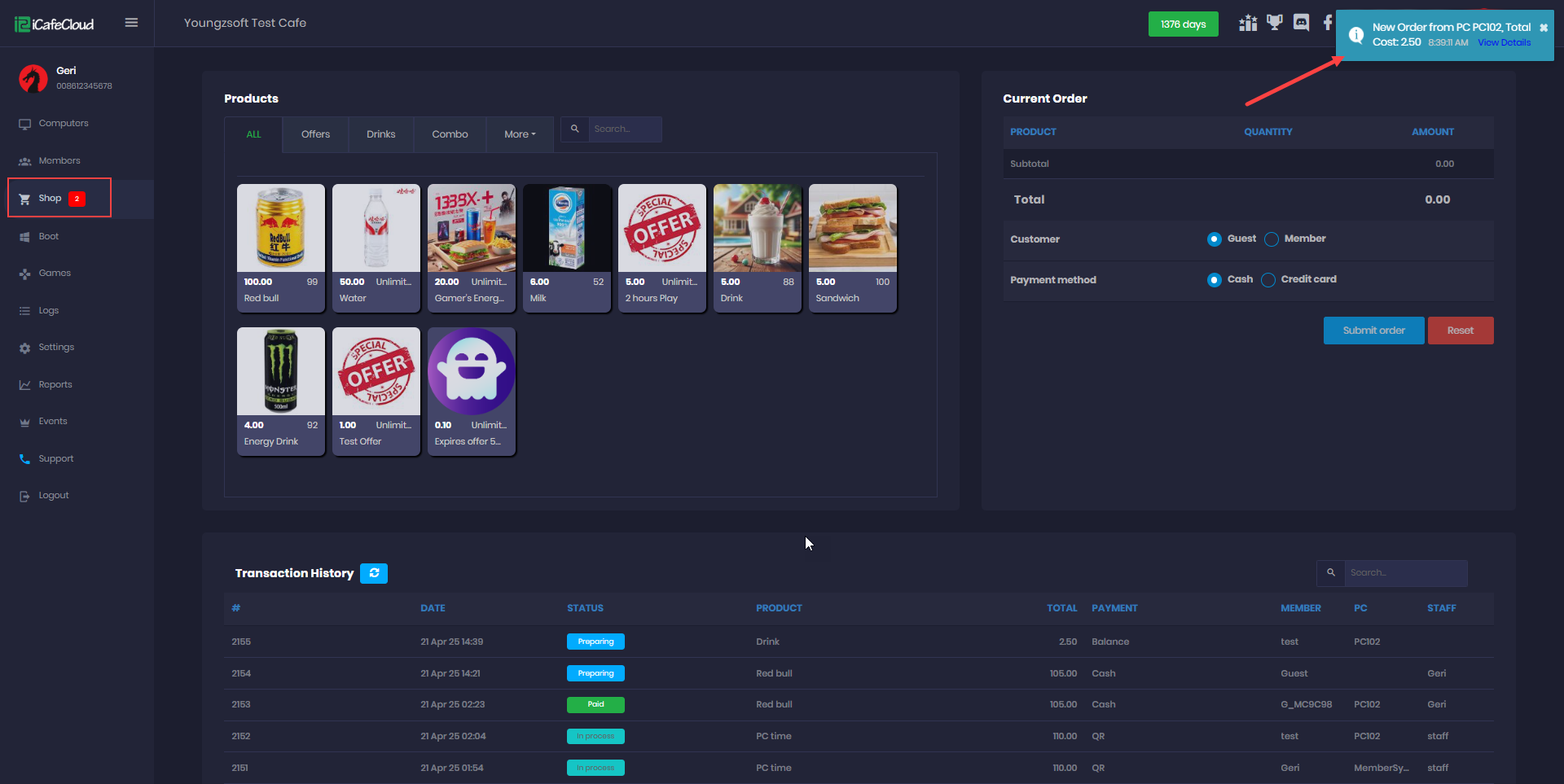 - When an order is placed from the client, a sound notification will play on the Control Panel (CP), and a popup notification will appear at the top right corner to alert you to check the order.(Figure 5)