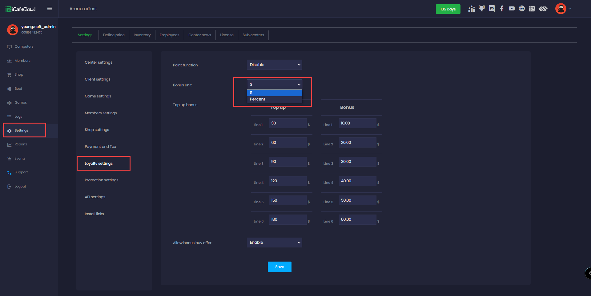 - Once the option is selected, you can edit the top-up and bonus settings. For instance, if you choose to set a percentage-based bonus, you can specify the percentage and click the save button. For example, by adding $10, it will automatically add 10%, resulting in a $1 bonus credited to the customer's account.(Figure 2).