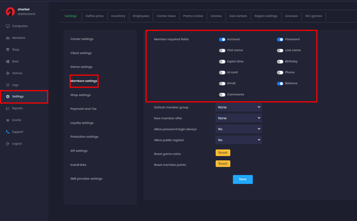 members, account, info, settings
