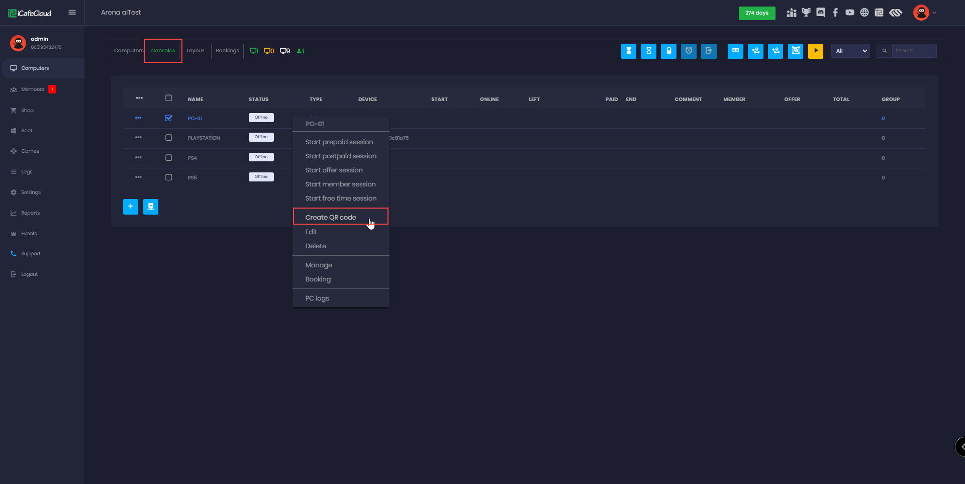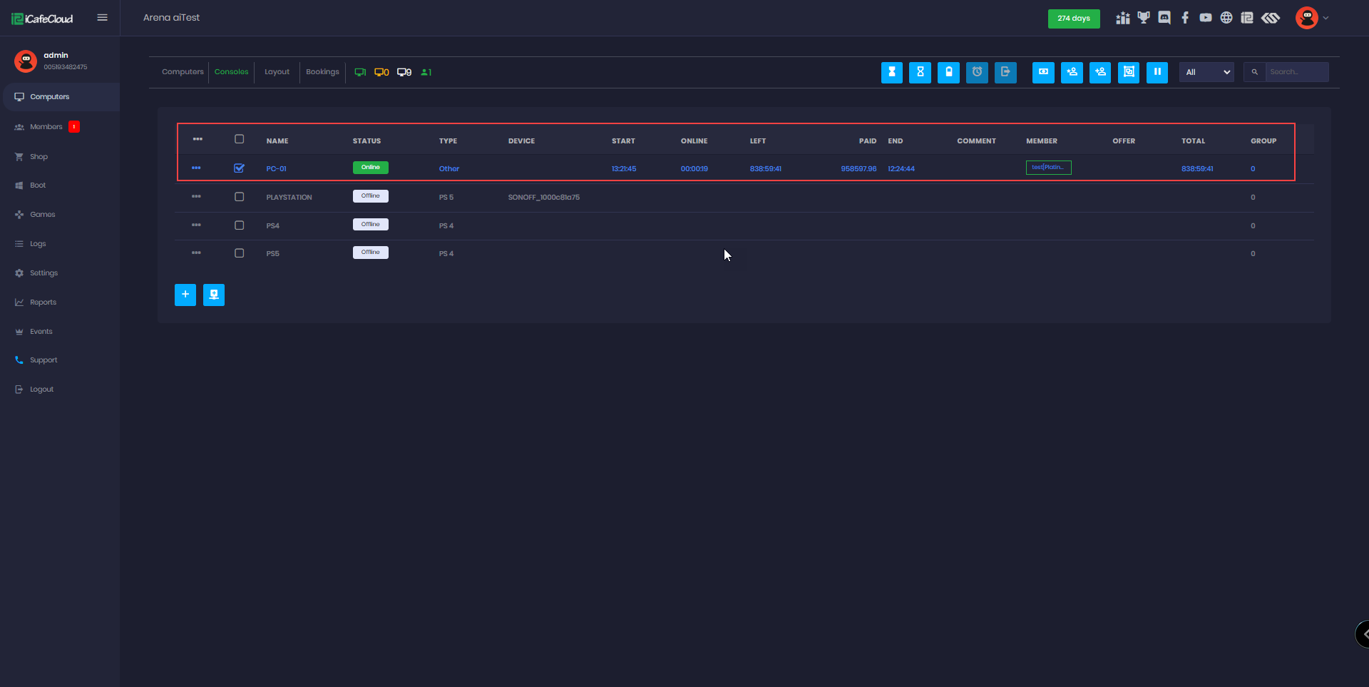 - Once the session starts, the Admin Panel will display the member as online and begin tracking the session time. In the example below, we demonstrate this using the console named GF-PS5-GF. (Figure 5 & 6)