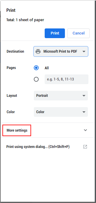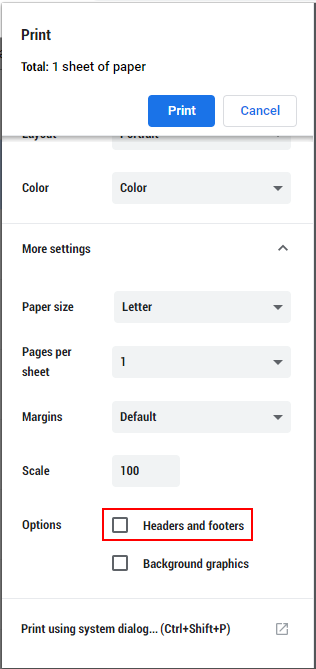 - If the printer prints a long receipt for guest account details, click "More settings" on print modal (Figure 6) and then uncheck "Headers and footers" (Figure 7).