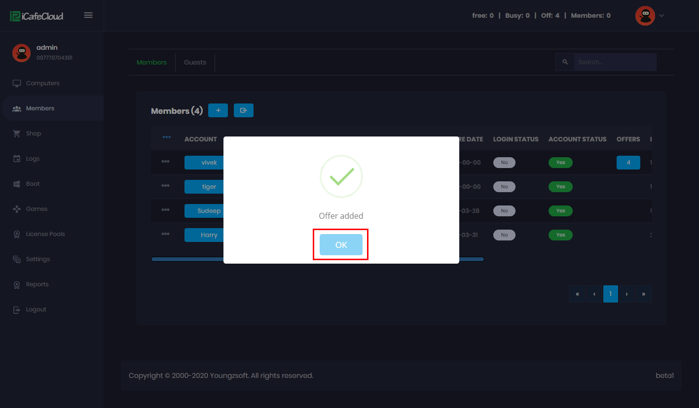- Login to the iCafeCloud web admin and then click “Members”, then right click on the member, to which you want to add an offer, then choose “Add Offer” (Figure 1).