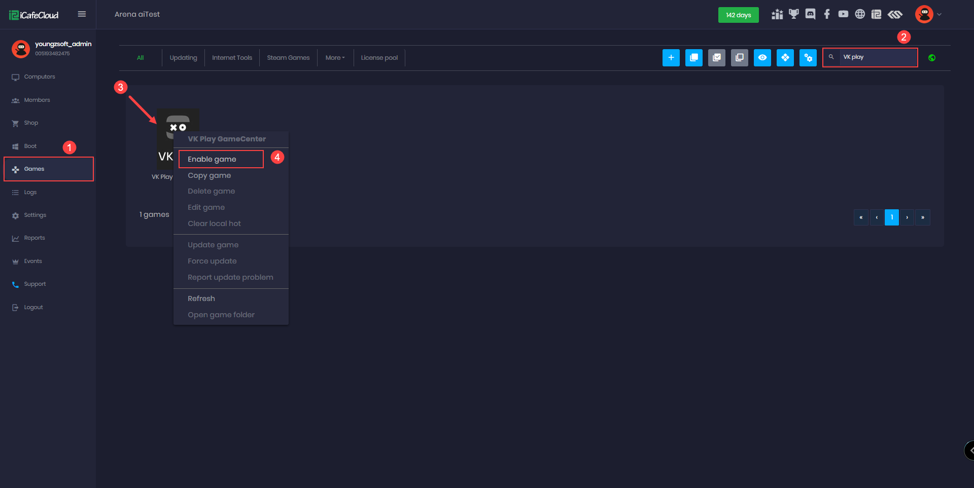 - Login to the cloud panel, from the Game page, search for “VK play” to see the game in the list then right click on the “VK play” and choose “Enable game” (Figure 1).