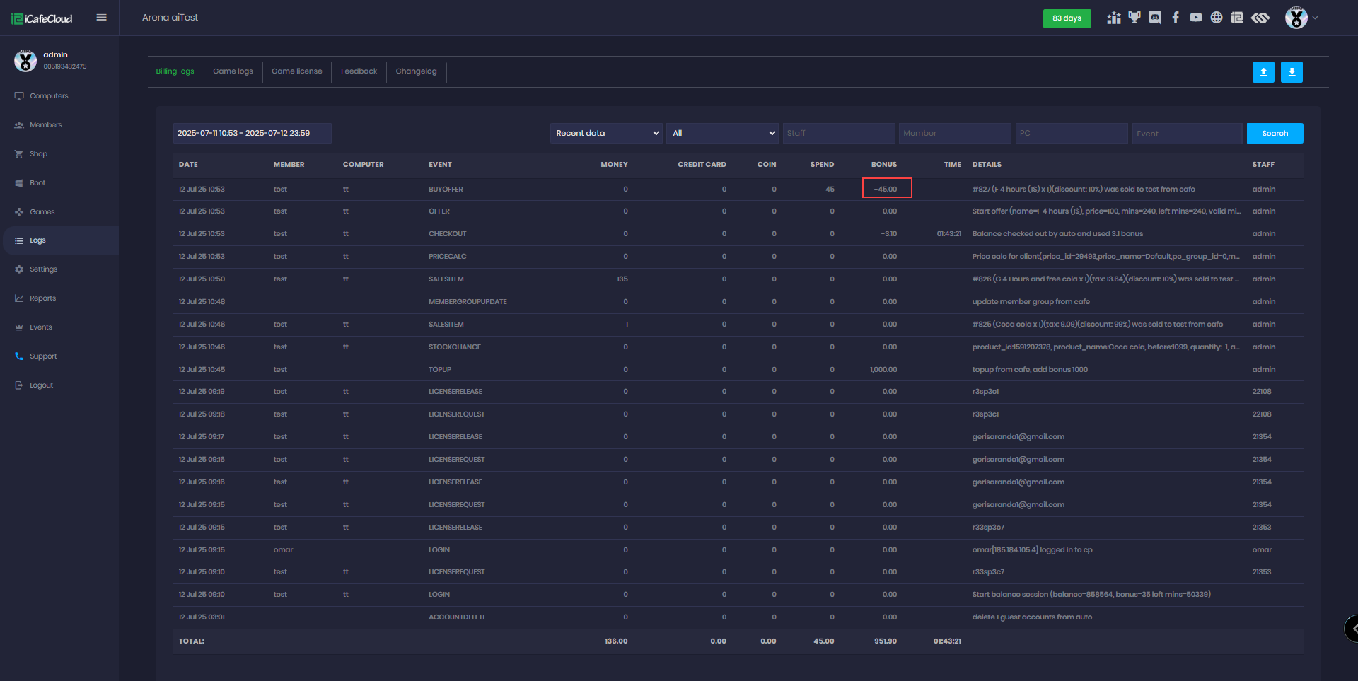 - On the Logs page, you can view the bonus amount that was used for each purchase. (Figure 5)