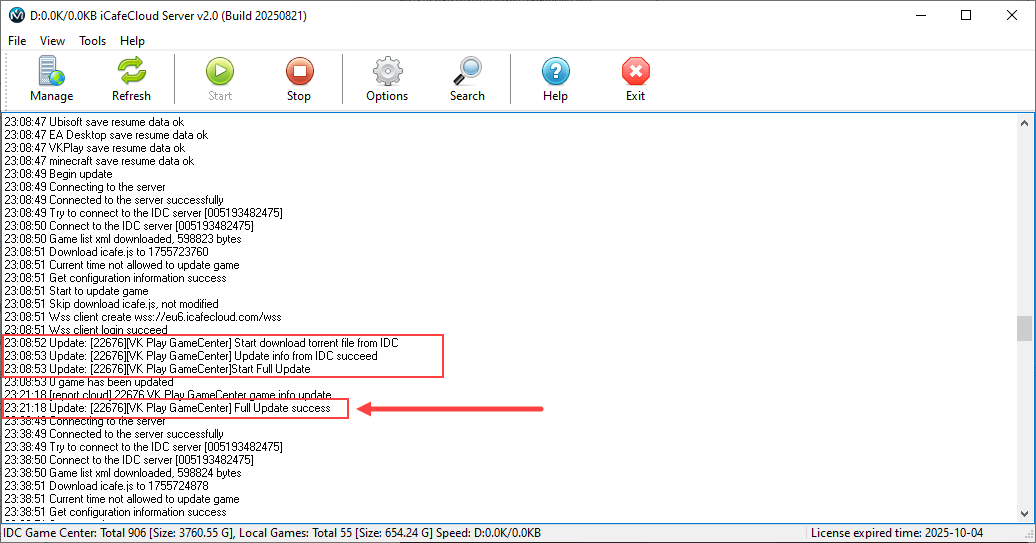 - When game update is enabled, the iCafeCloud server logs will display the list of games added for auto-update. (Figure 2)