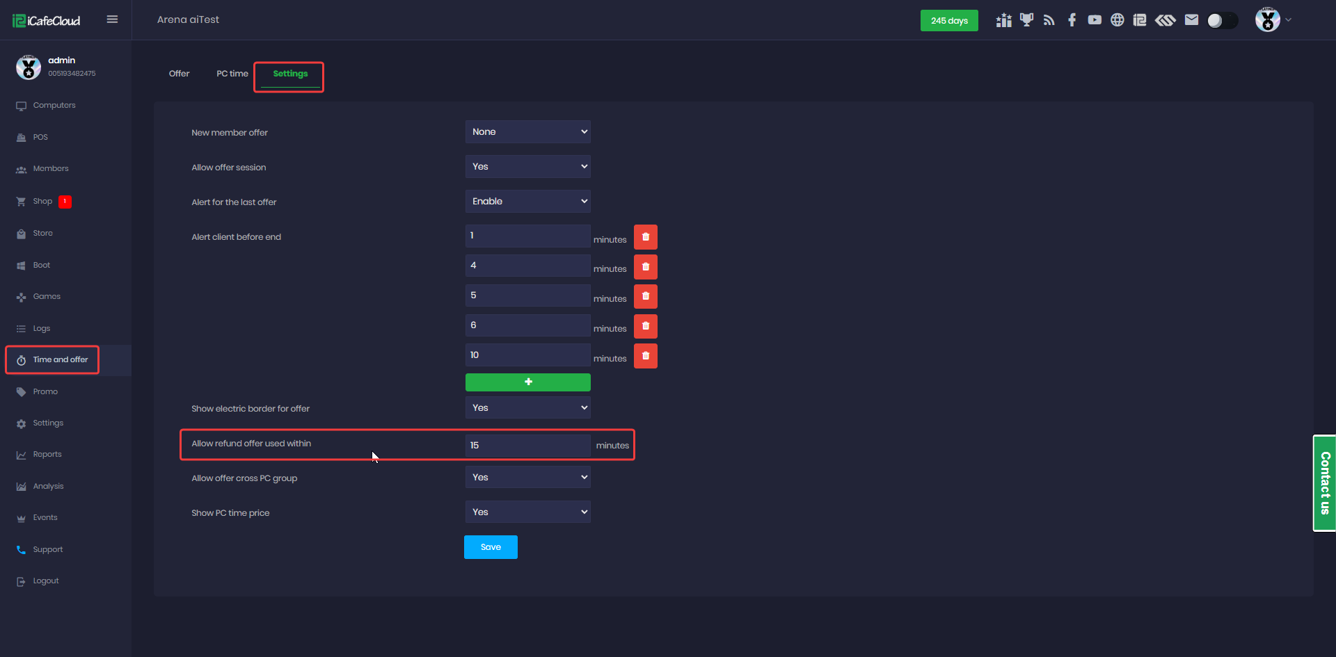 - Go to Time and Offer → Settings, and set a value (in minutes) for “Allow refund offer used within”.