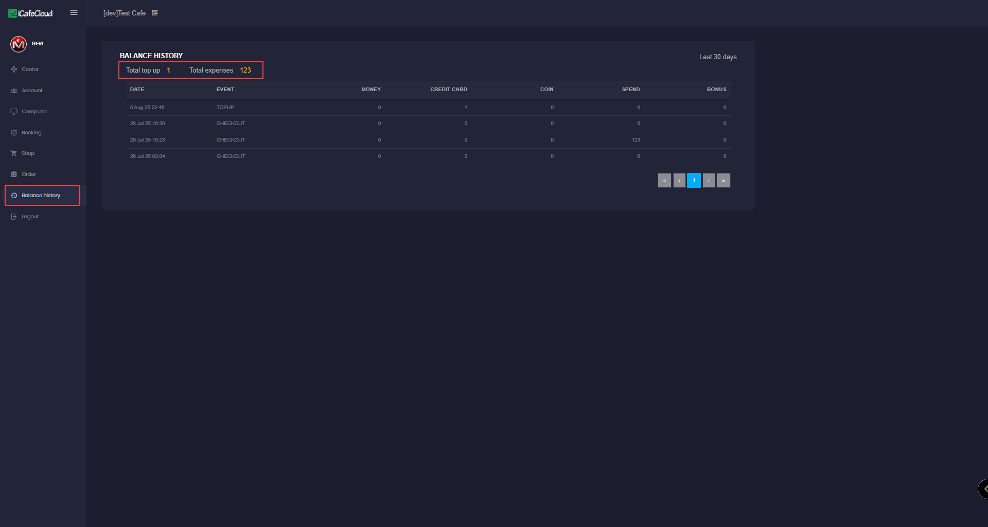 - On the Balance History page, you can view a complete record of the member’s balance activity from the account creation date to the present. This includes money added, credit card payments, coins, spending, and bonus top-ups. At the top, you can also see the total top-ups and total expenses. (Figure 1)