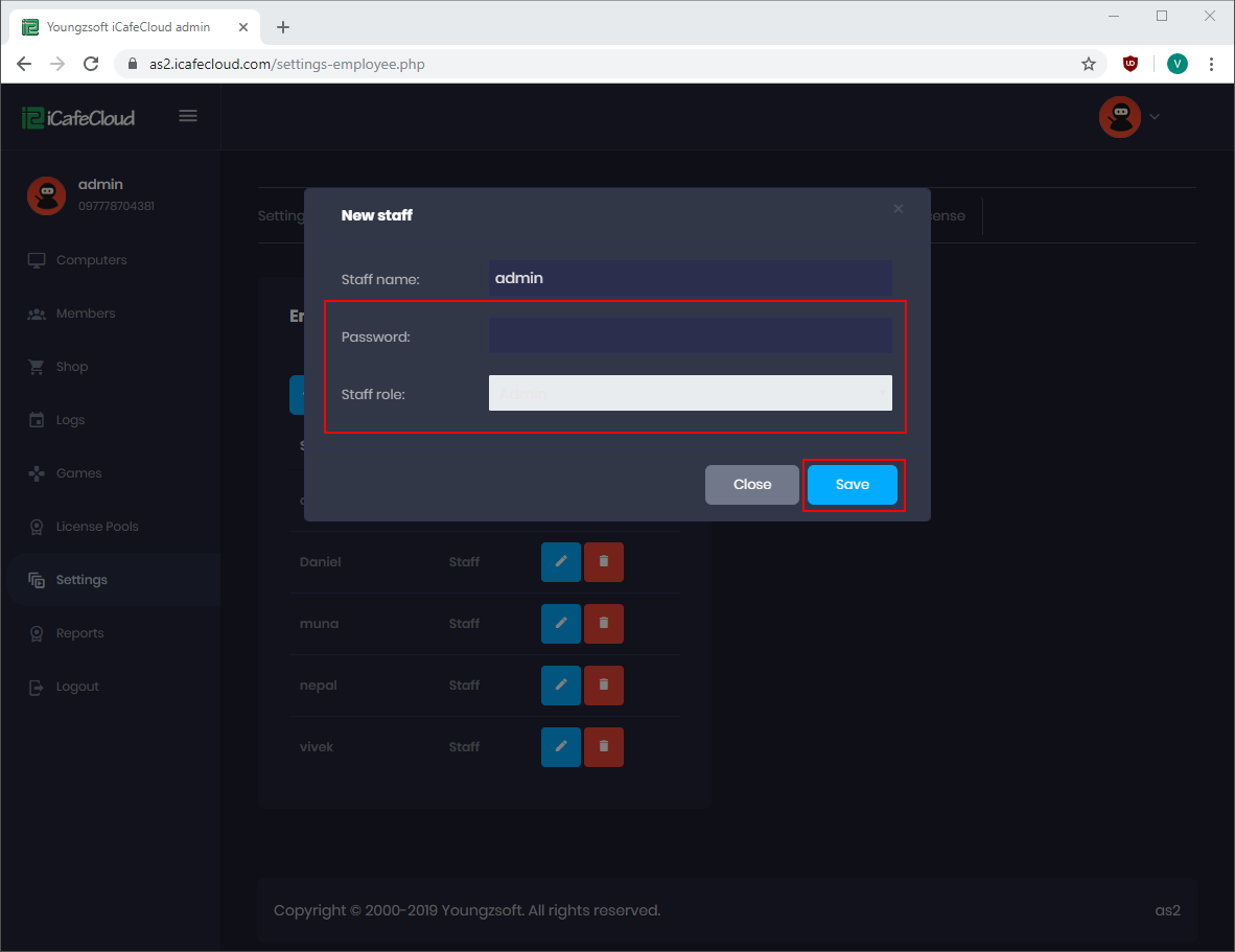 - On “New Staff” modal, enter the new password and click on the “Save” button (Figure 2).