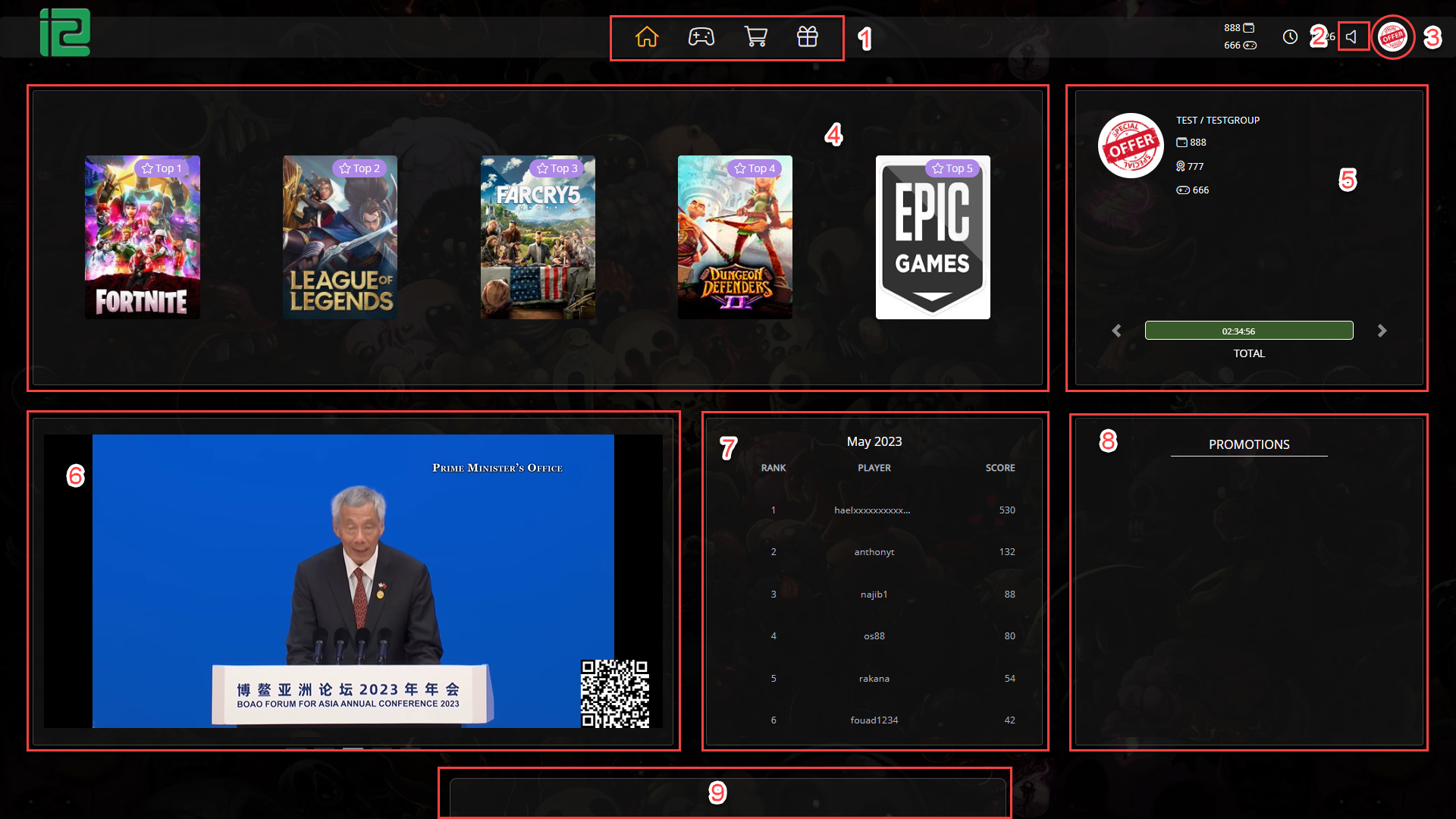 The following explains the main functionalities of the iCafeMenu interface, including the Home Page, Games Page, Shop Page, Event Page, how to switch the main menu after login, and how to view the Order List.