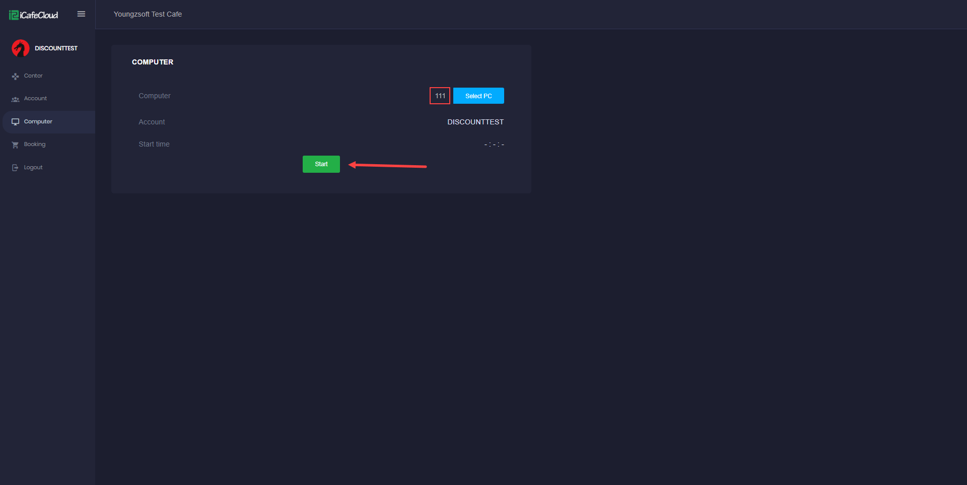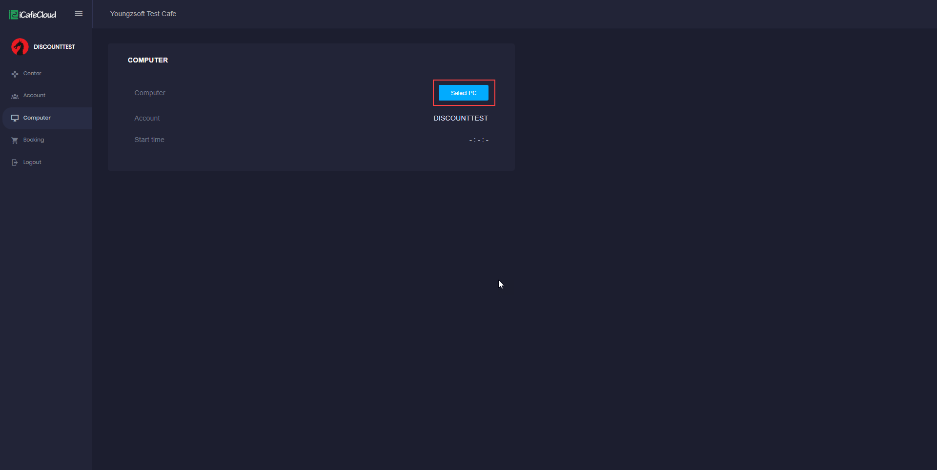 - The "Computer" page is used to start a session. You'll see a Select PC button, along with your member account name and the session start time displayed below it. Click on Select PC to begin.(Figure 1)