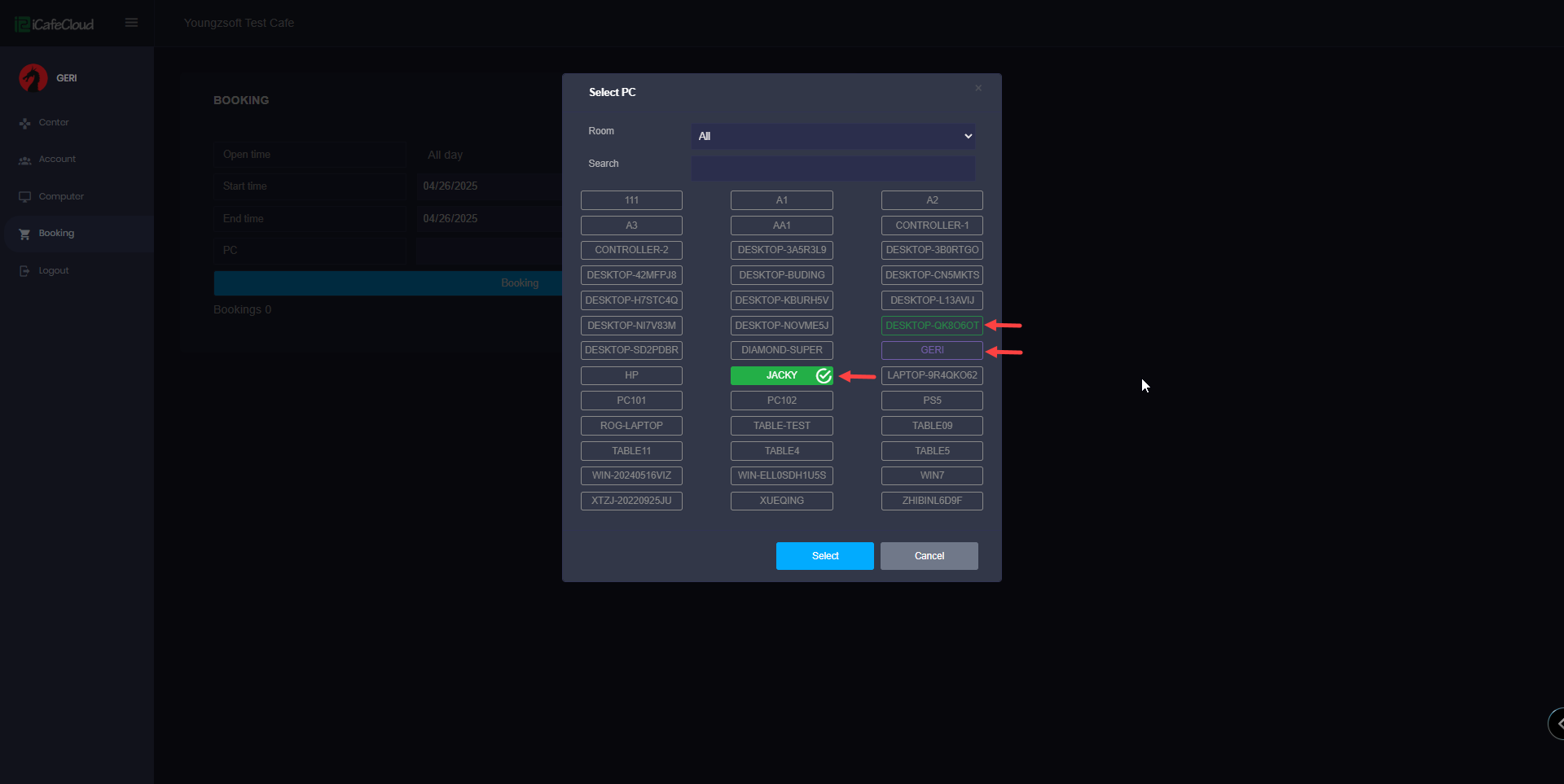 - You can find the PC you want to start by selecting the room or by searching for the PC name directly. Once you find it, click on the PC, then click the Select button to continue.(Figure 2)