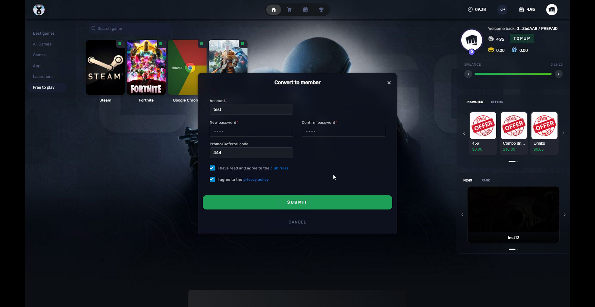 The following explains how prepaid or offer sessions on a client PC and convert the session directly to a member account.