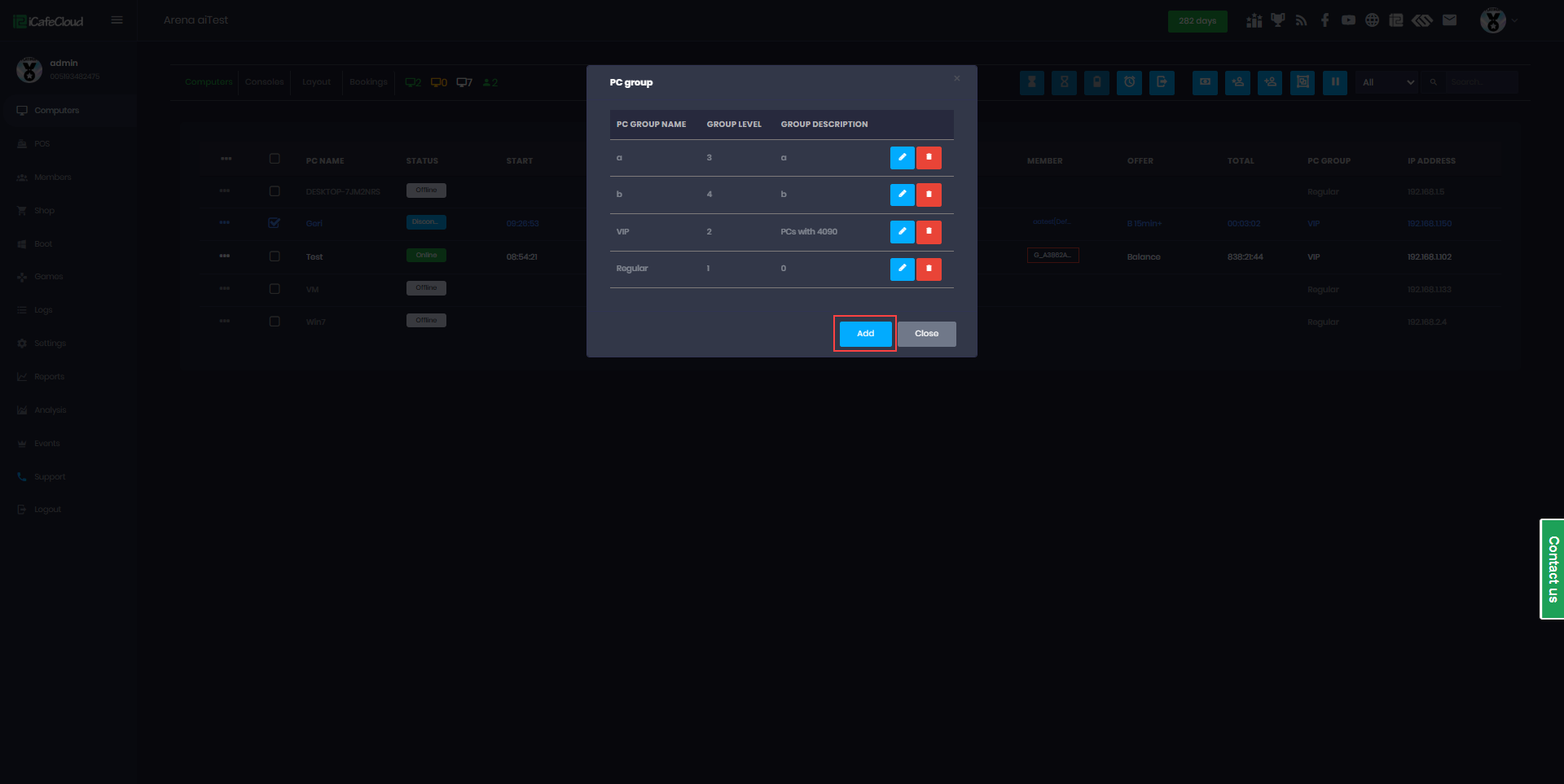 The following explains how to create and use PC groups and levels to organize computers by category (ex VIP, regular etc). After creating groups on the PC management page, you can assign specific pricing and offers to each group.