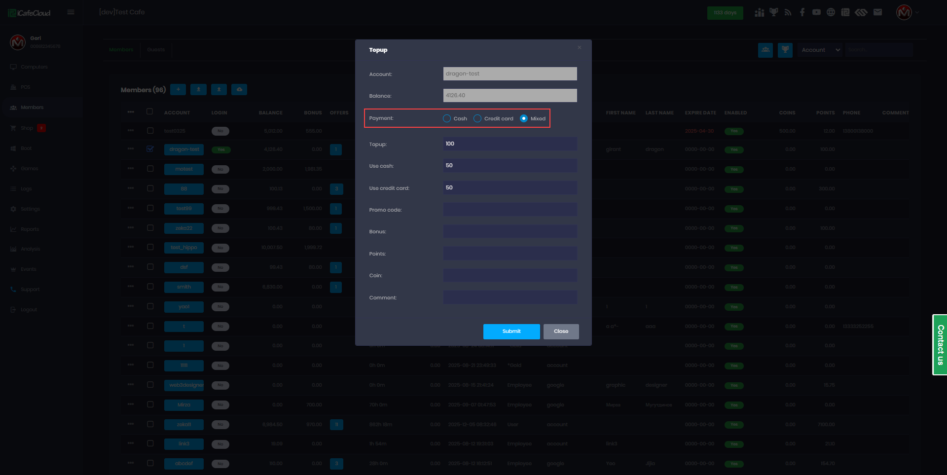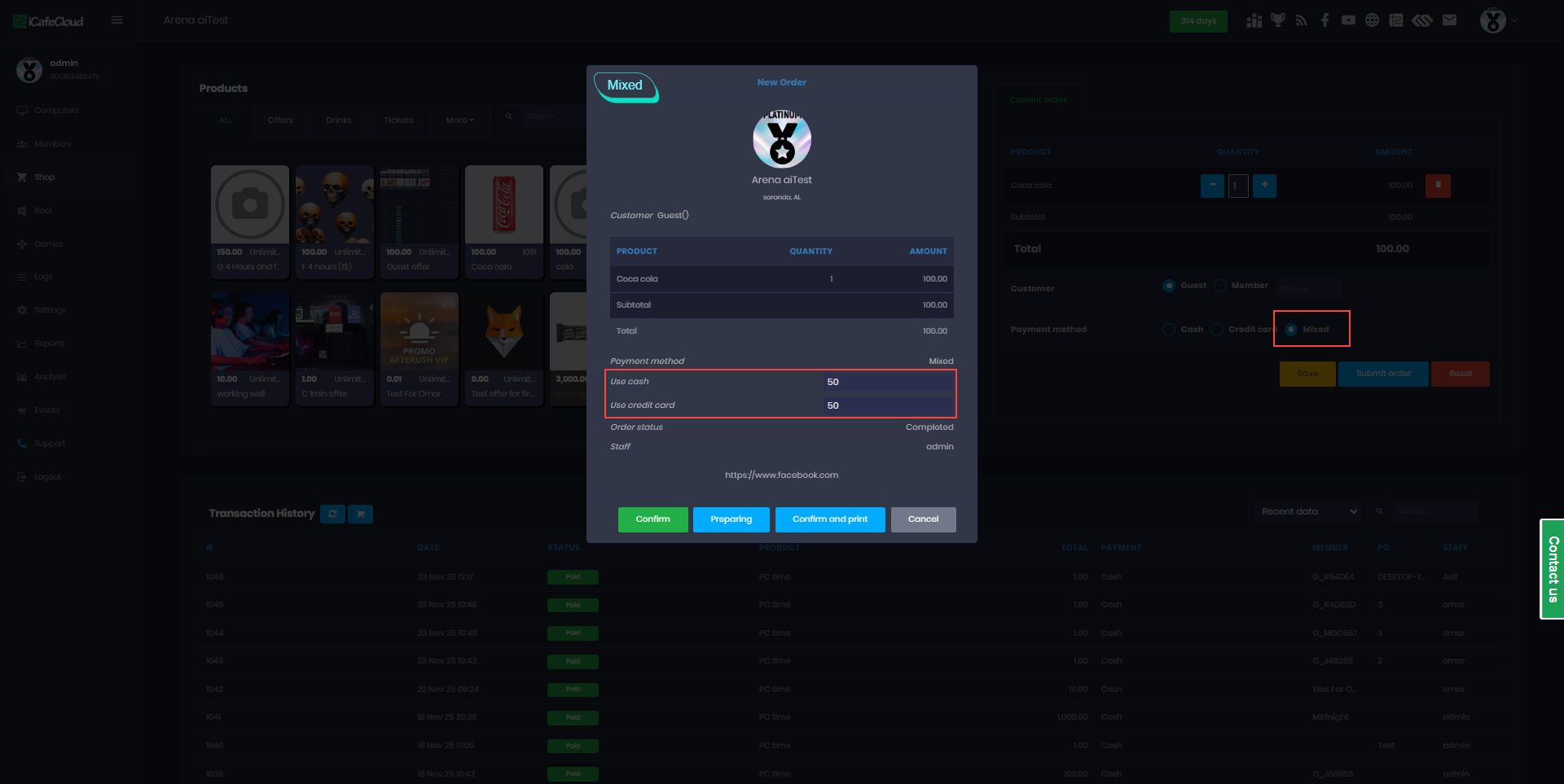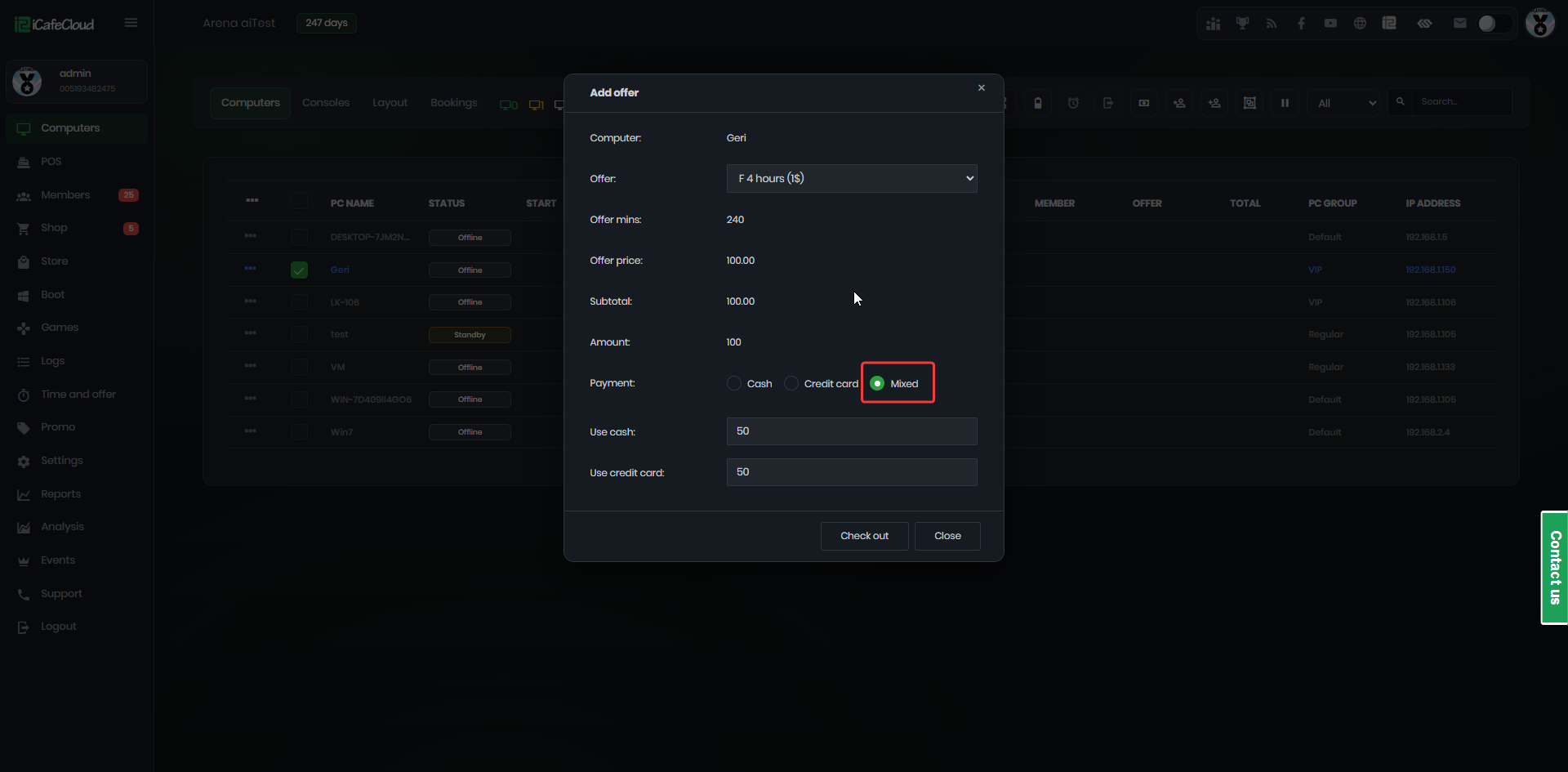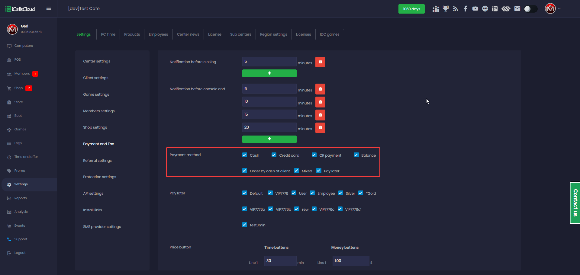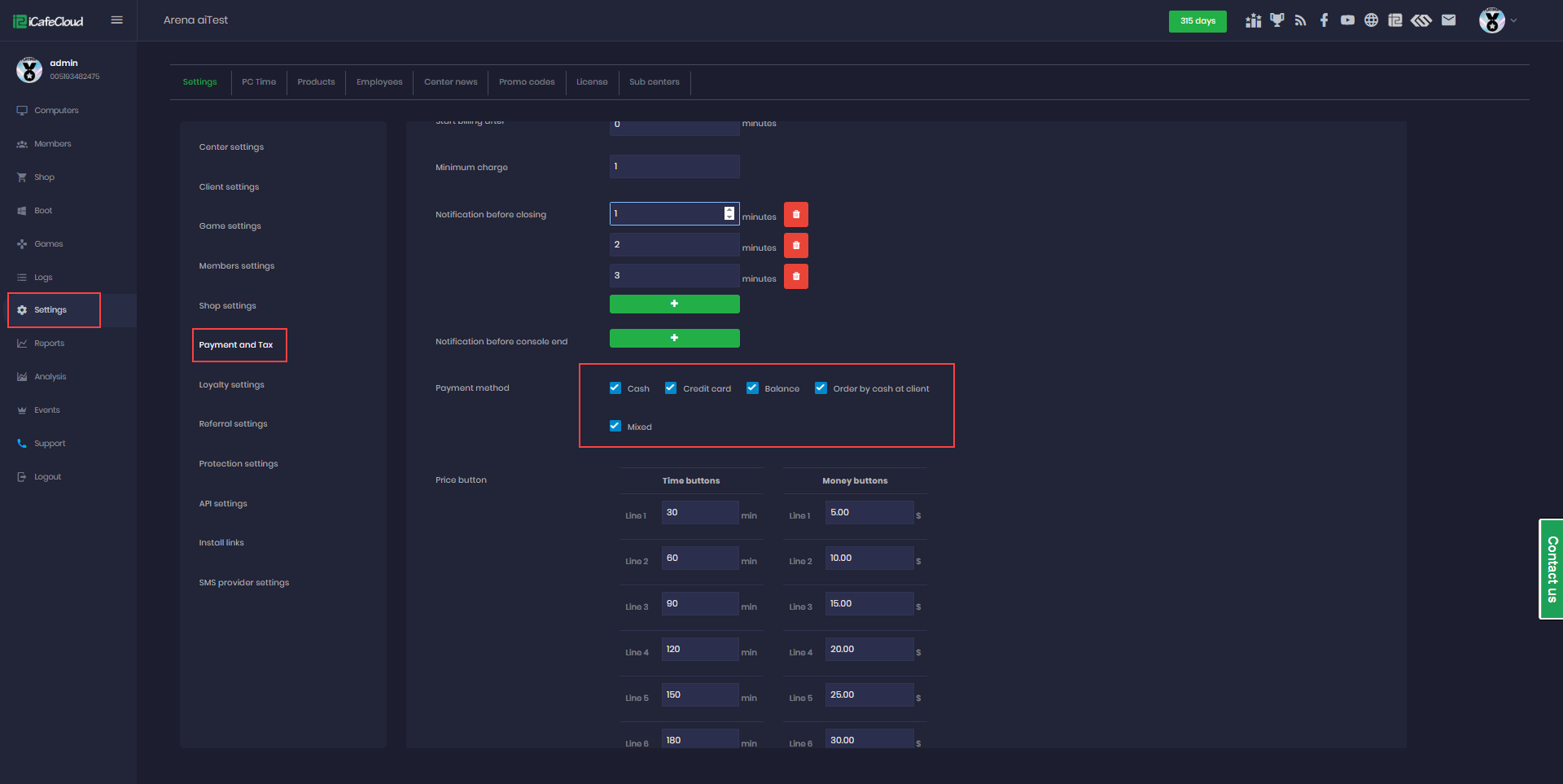 The following explains how to enable or disable specific payment methods for your center. iCafeCloud supports multiple payment options such as cash, credit card, balance, order by cash at client and mixed payments and you can customize which methods are available based on your needs.