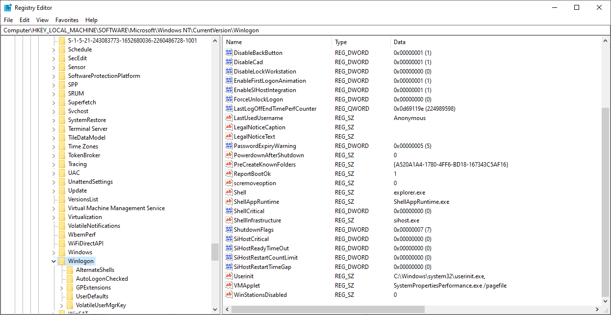 HKEY_LOCAL_MACHINE\SOFTWARE\Microsoft\Windows NT\CurrentVersion\Winlogon (Figure 2).