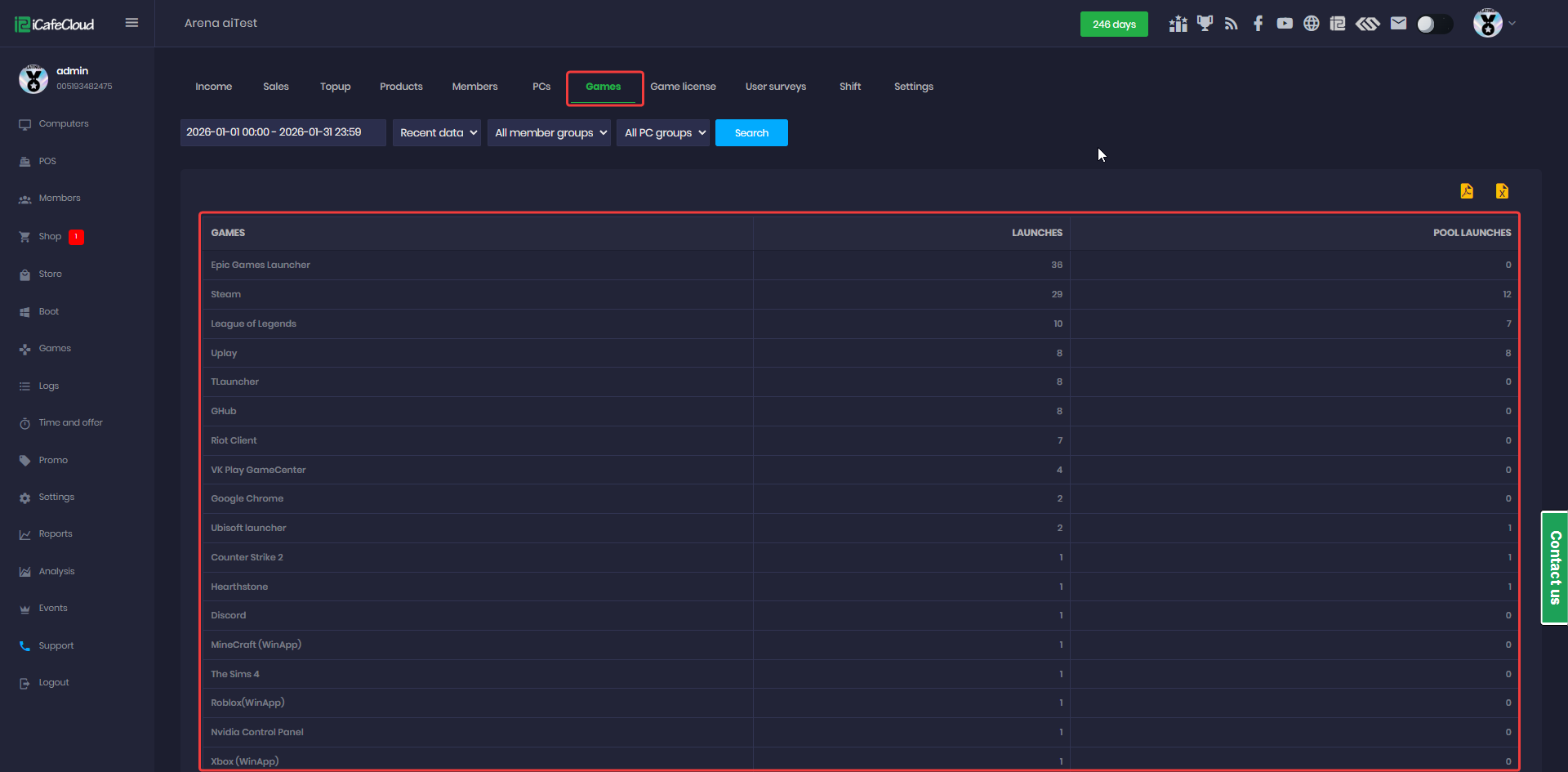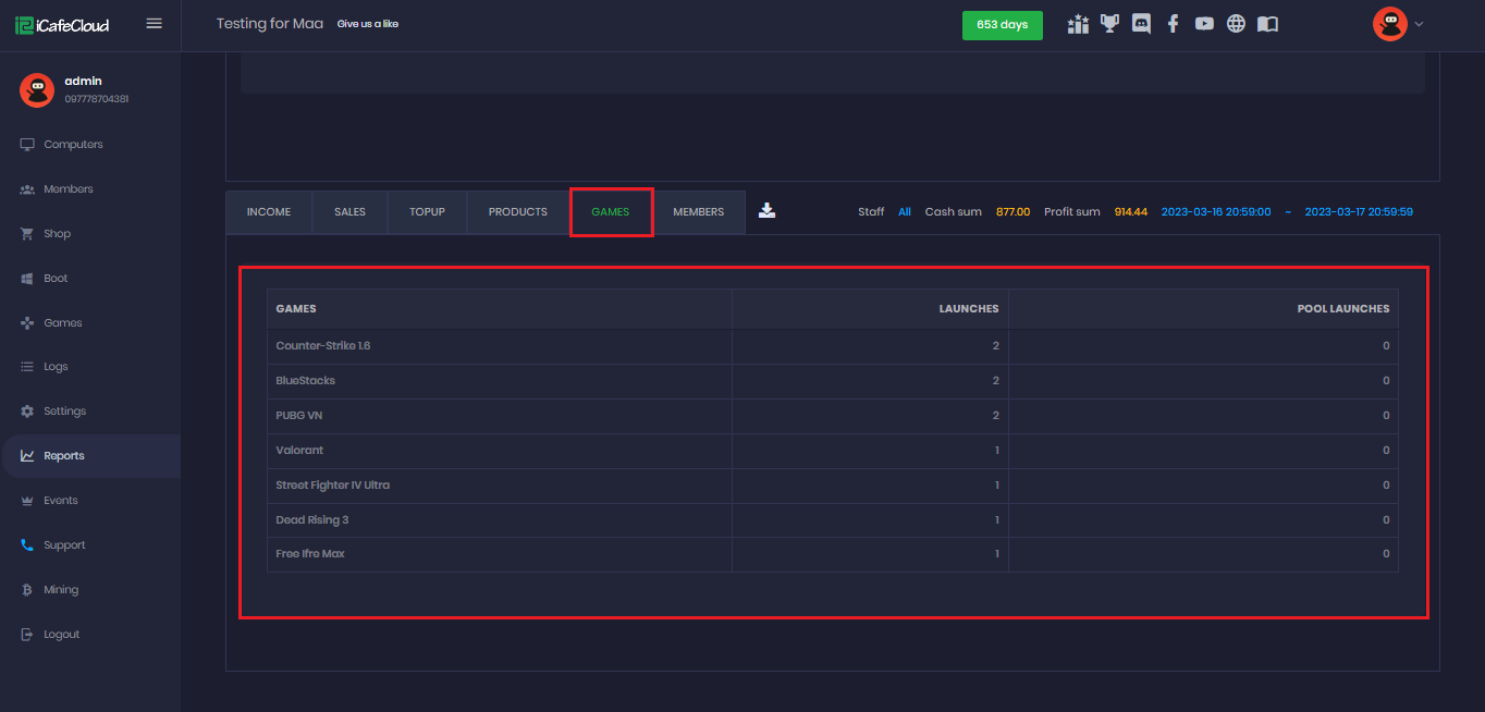 Reports on games also include the games and the number of times they have been played by the customers and how many times they are launched through the license pool function . It is a real time data you can check the time range in blue color (Figure 8).