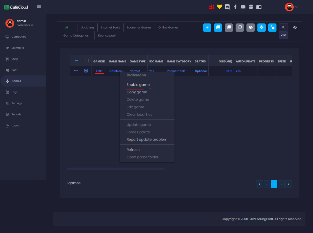 - Then, open “Games” page and search ‘iCafeMenu” and right click on it and choose “Enable game” (Figure 2)