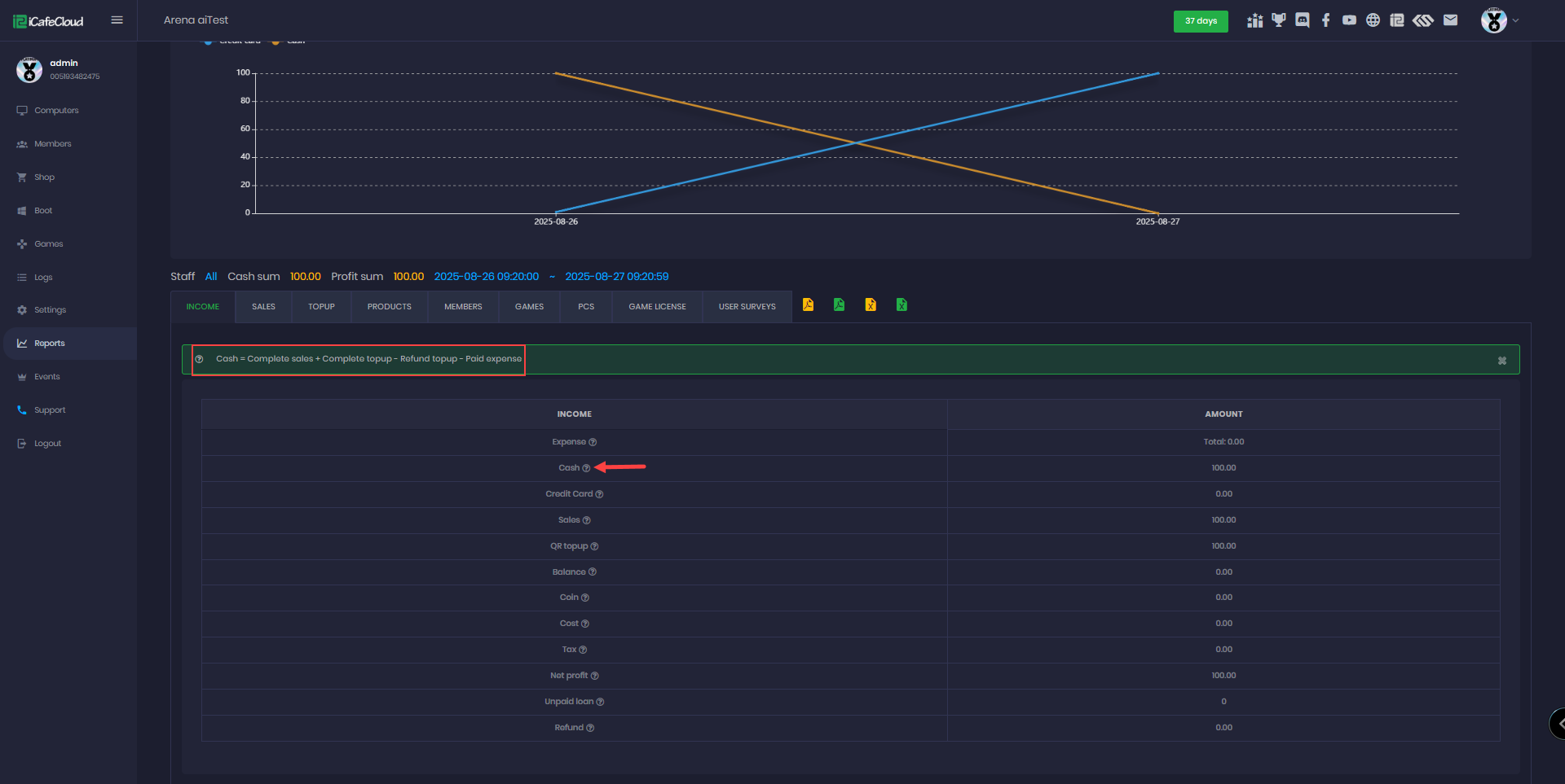 - Cash = Completed sales + Complete topup + Tax - Refunds - Paid Expenses