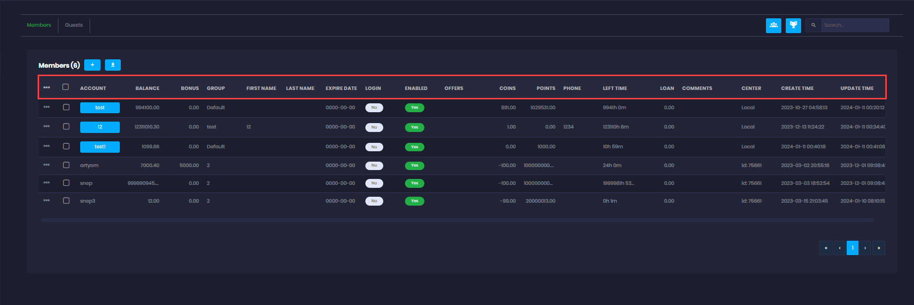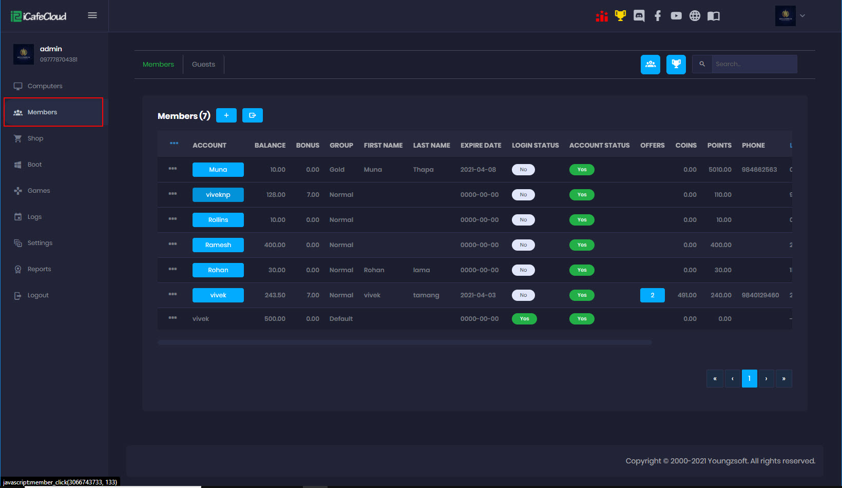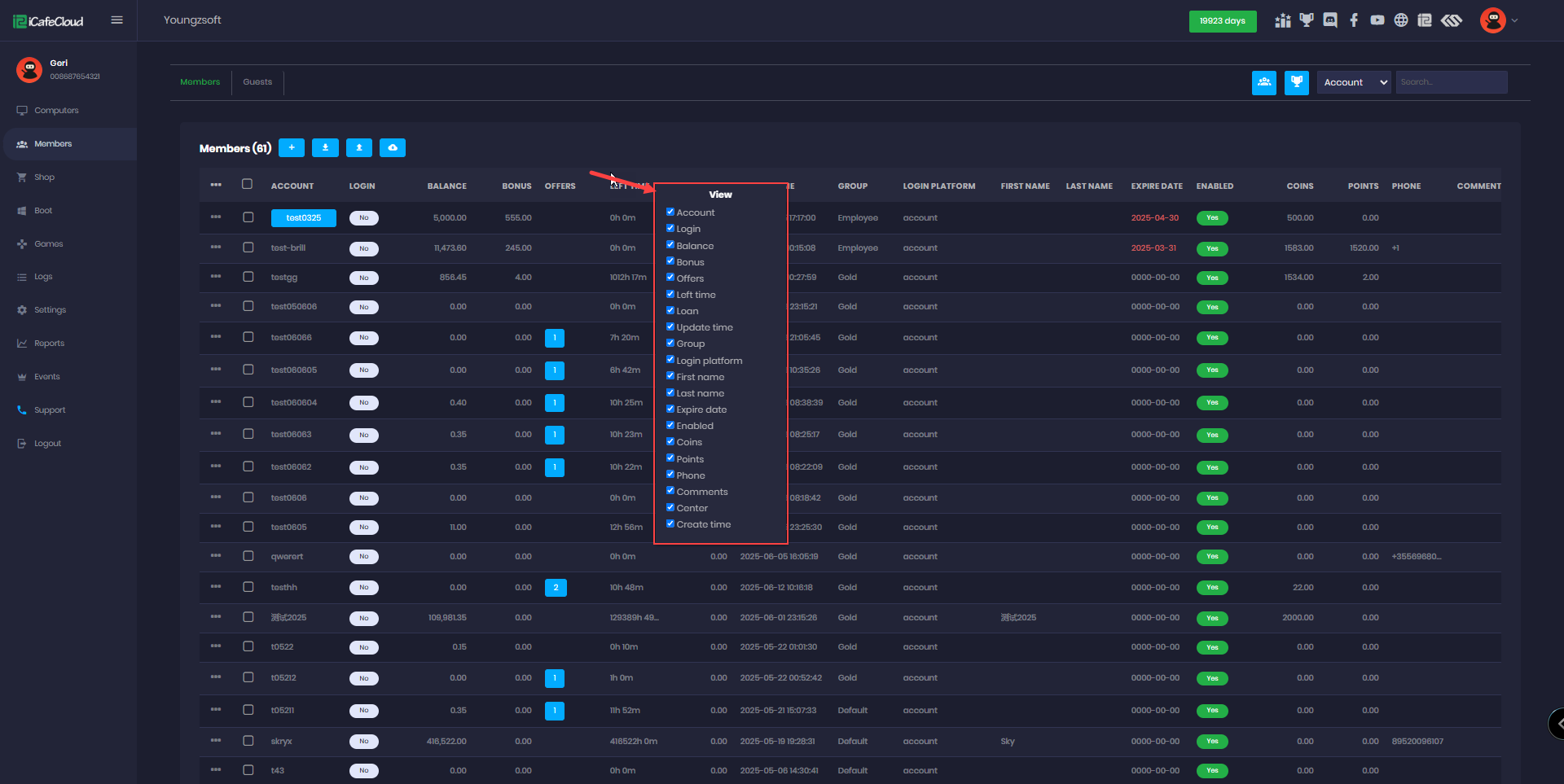 The "Members" page displays account details including account name, balance, bonus, group, personal information, login status, offers, coins, points, phone number, remaining time, loans, comments, and creation/update timestamps, with various options for managing and viewing member information.