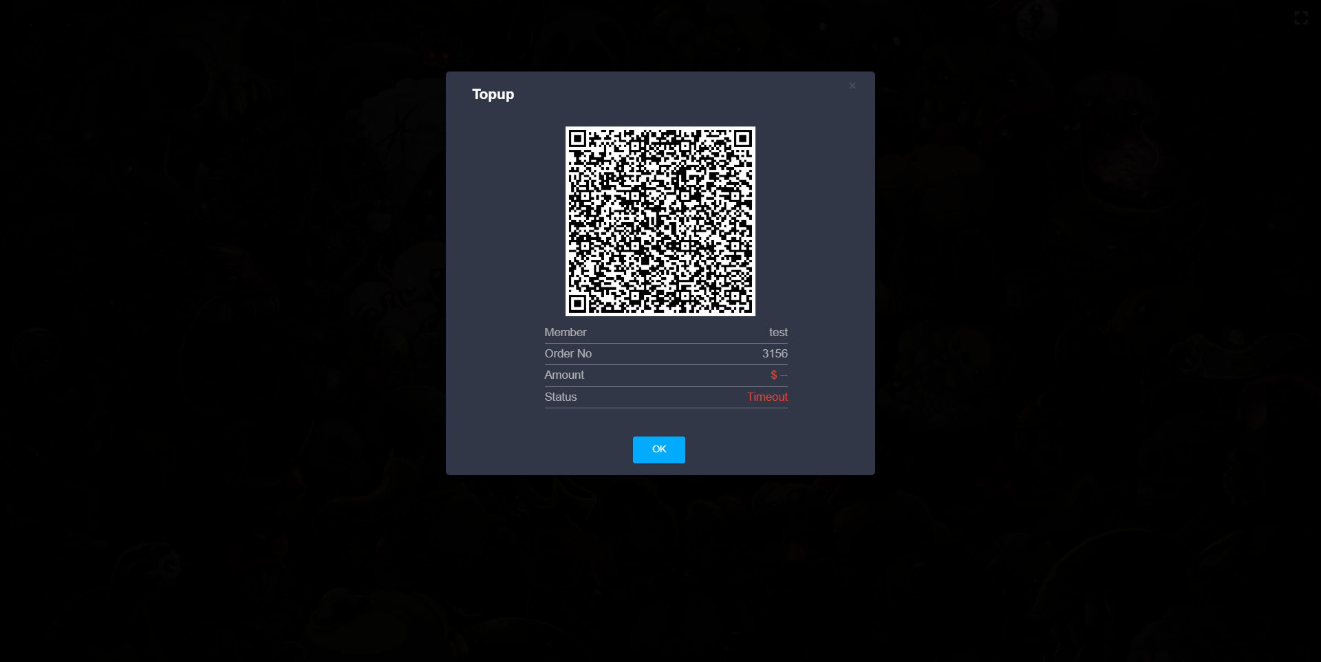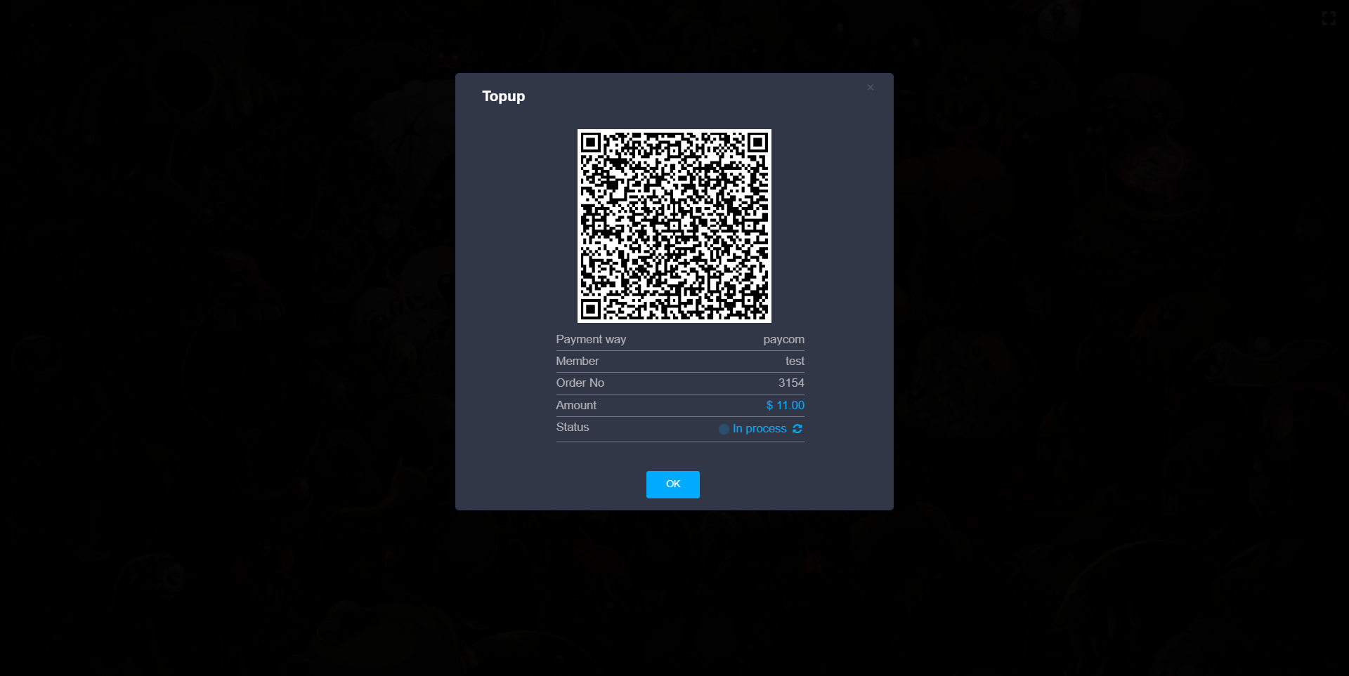 - After completing the form, click OK. You will be redirected to a page displaying a QR code Members name, order number , amount and the Status of the payment.