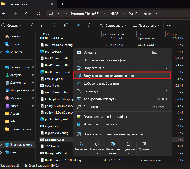 - For DualConnector v1, you must register the service. To do this, run RegisterDC.bat from the DualConnector directory (by default, C:\Program Files (x86)\INPAS\DualConnector) with administrator rights. (Figure 5)