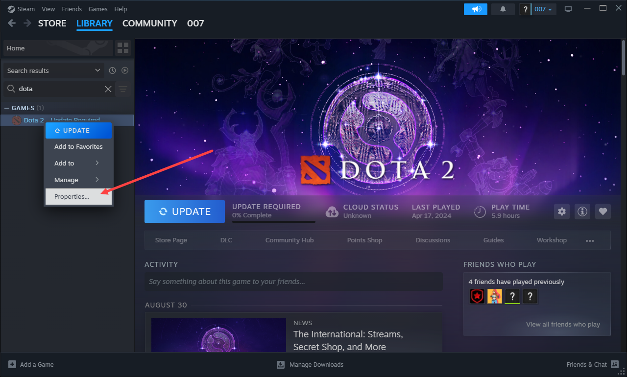 - Open Dota 2 in Steam and click on Properties. (Figure 1)