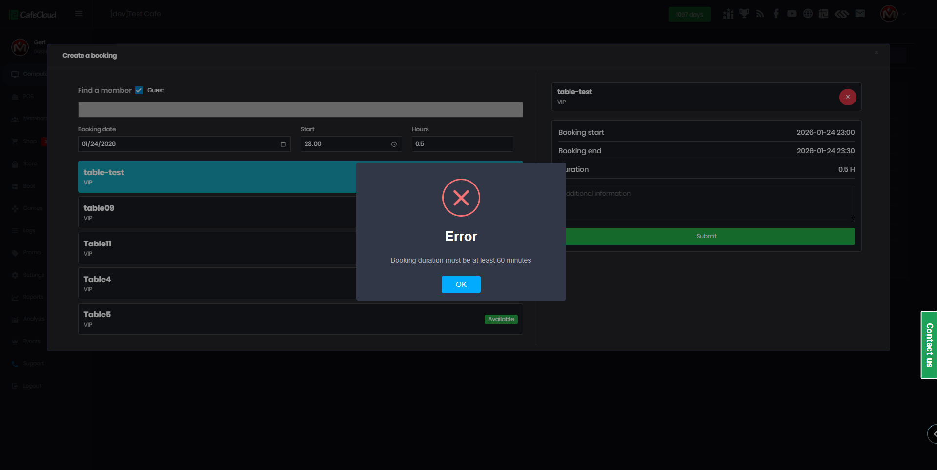 - If you attempt to book for less time than the minimum set in the settings, an error message will appear: