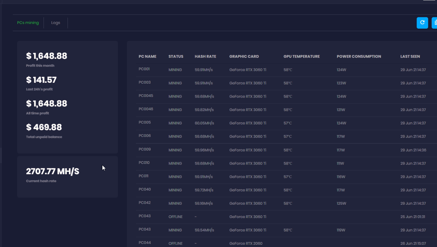 - List of the pcs showing hash rate, GPU model, temp, power,mining option and last time used in mining.