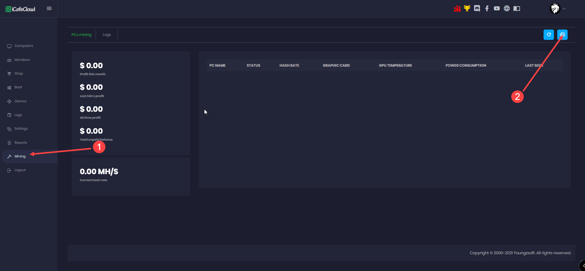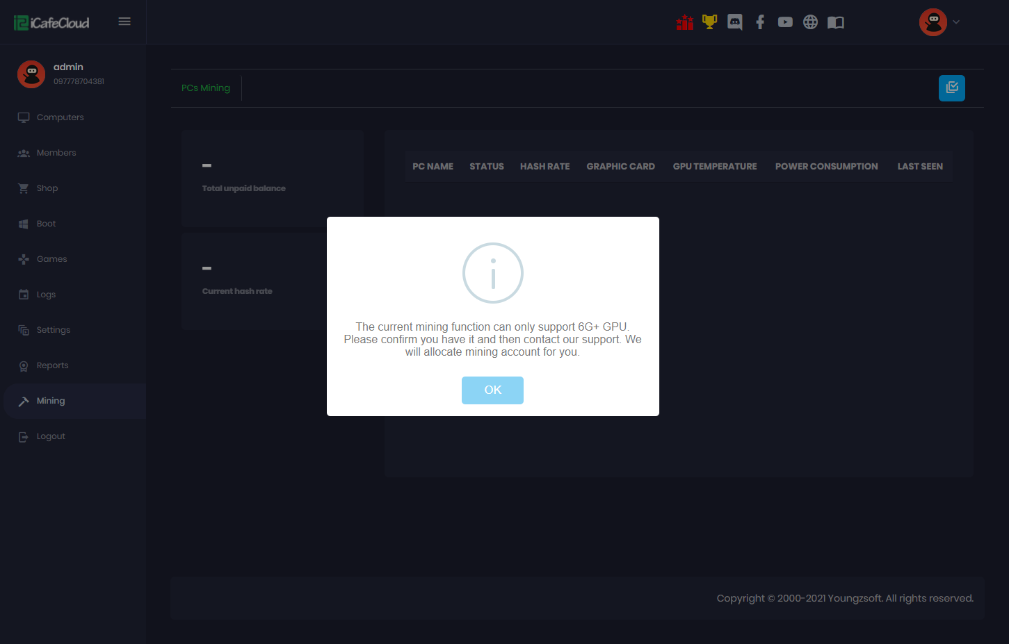 - iCafeCloud has a mining function with various options for the centers.