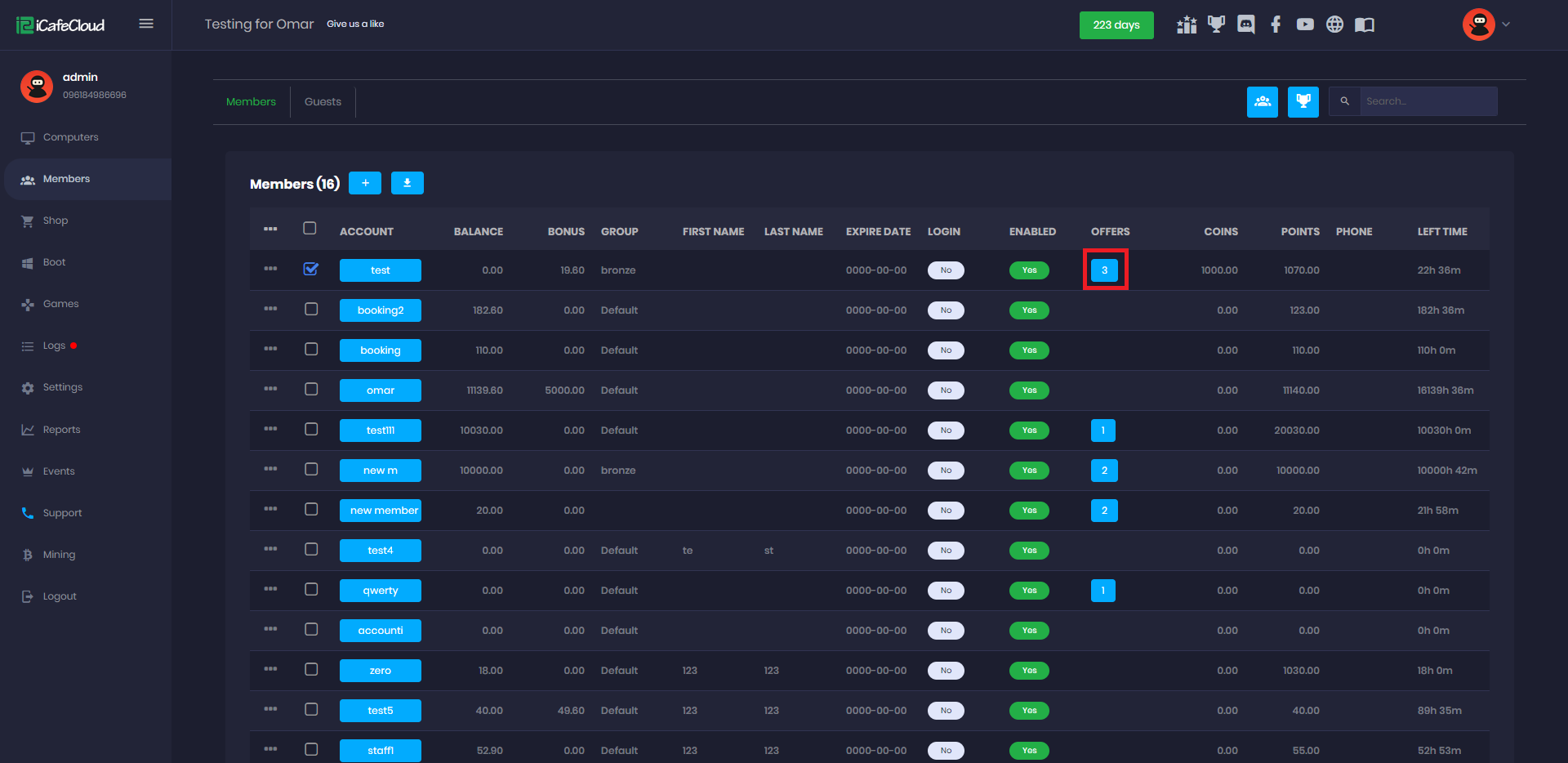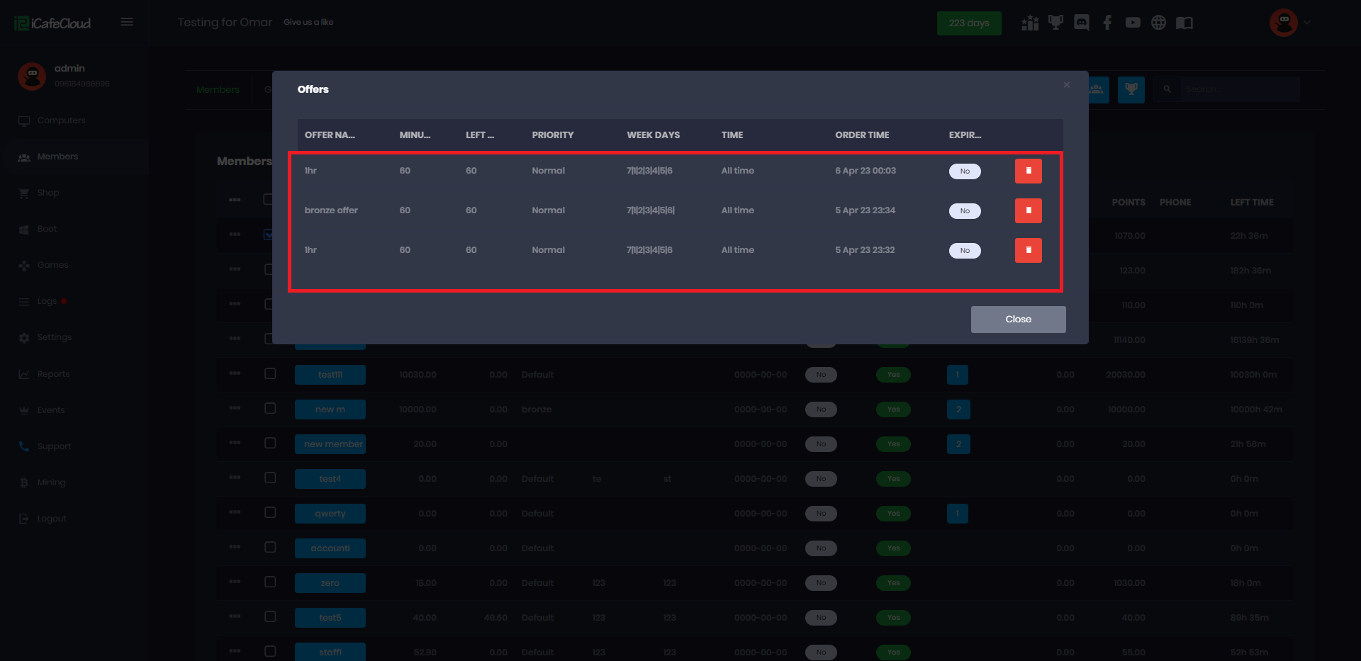 - If you click the number of offers that a member has, offers will be listed in detail. Offer can be deleted with the delete button (Figure 8).