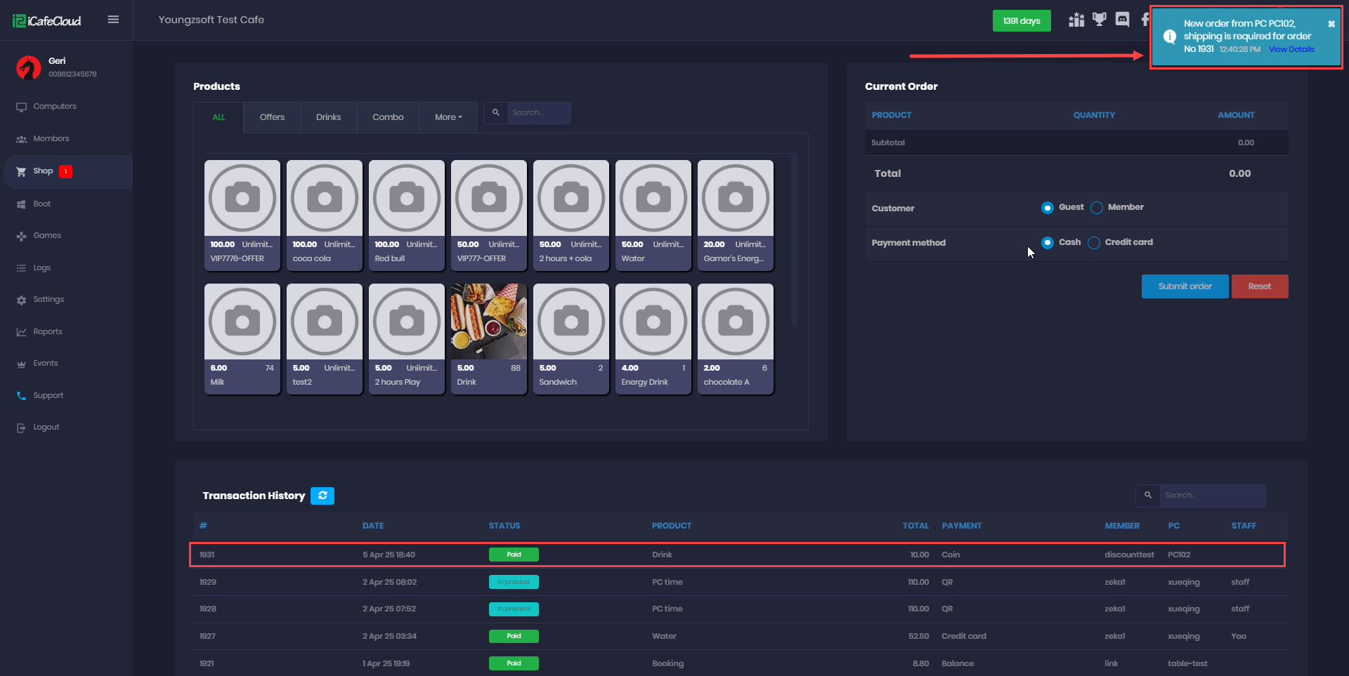 - When an order is placed from the client, a sound notification will play on the Control Panel (CP), and a popup notification will appear at the top right corner to alert you to check the order.(Figure 5)