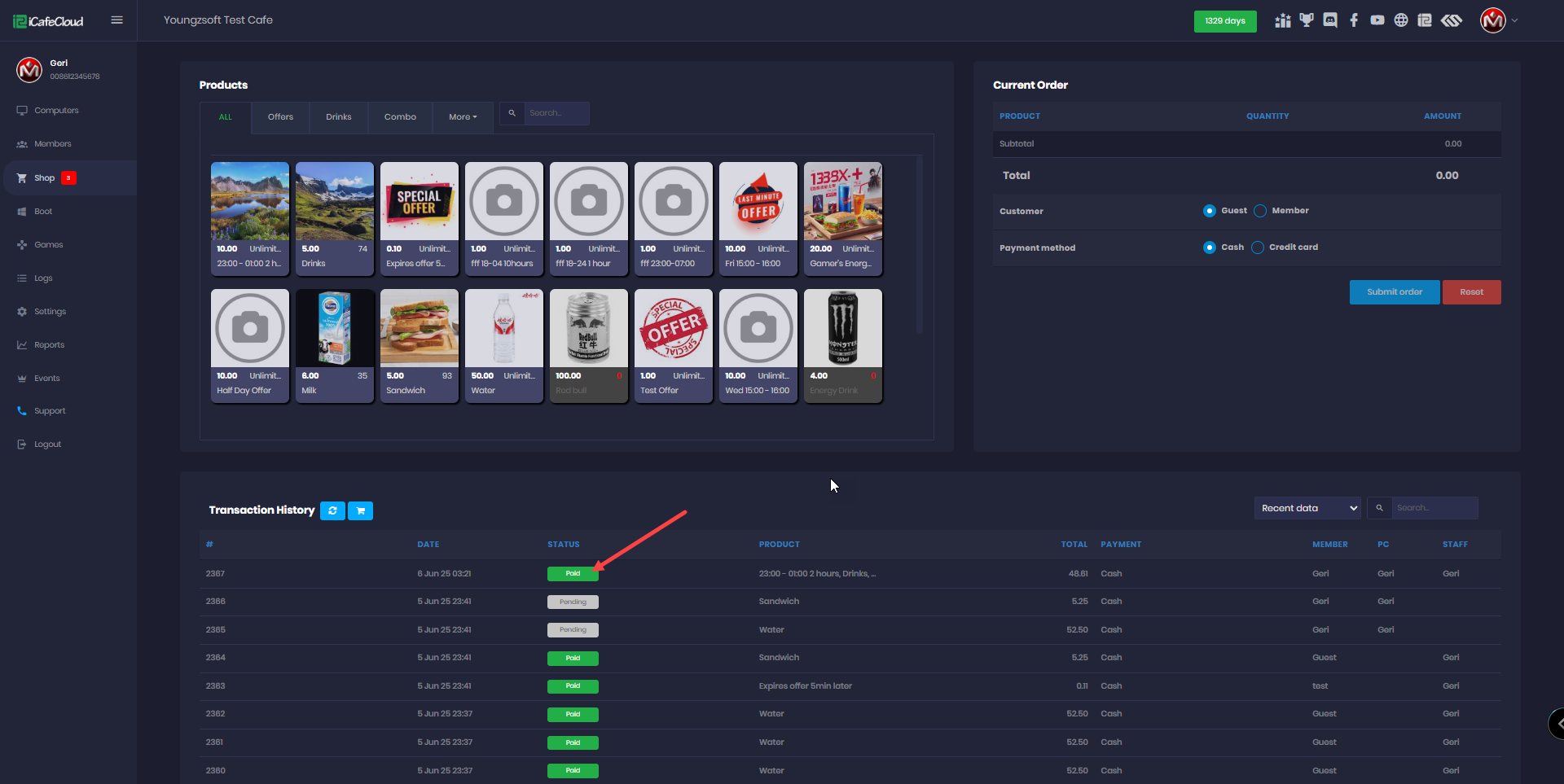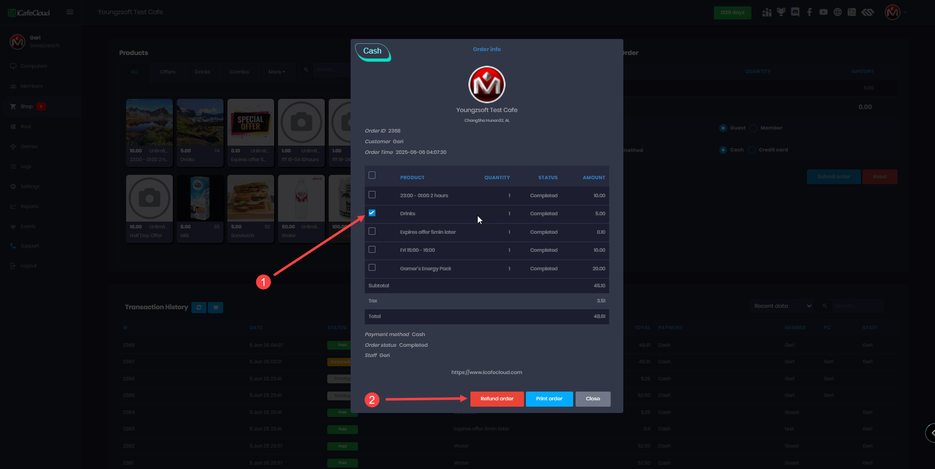 - Go to the Shop page, then open the Transaction History. Find the order you want to refund and click on it.(Figure 1)