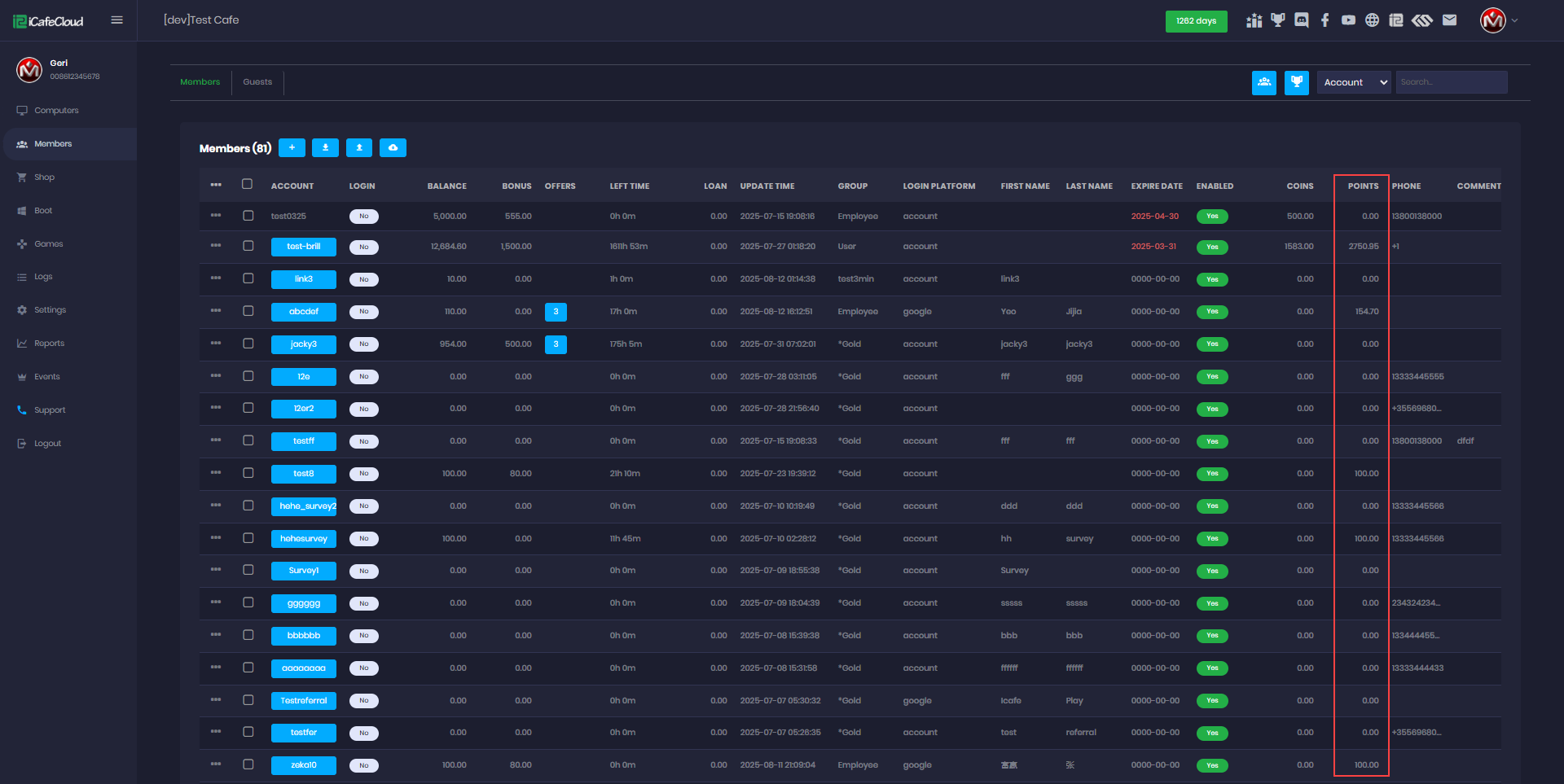 - Once the points function is enabled, you can view the accumulated points for a member in the Members page under the Points column.(Figure 3)