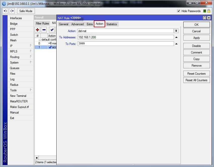 3) Click the "Action" tab, change the "Action" value to "dst-nat", the "To Addresses" to "192.168.1.200" and "To Ports" to "3999" (Figure 3).
