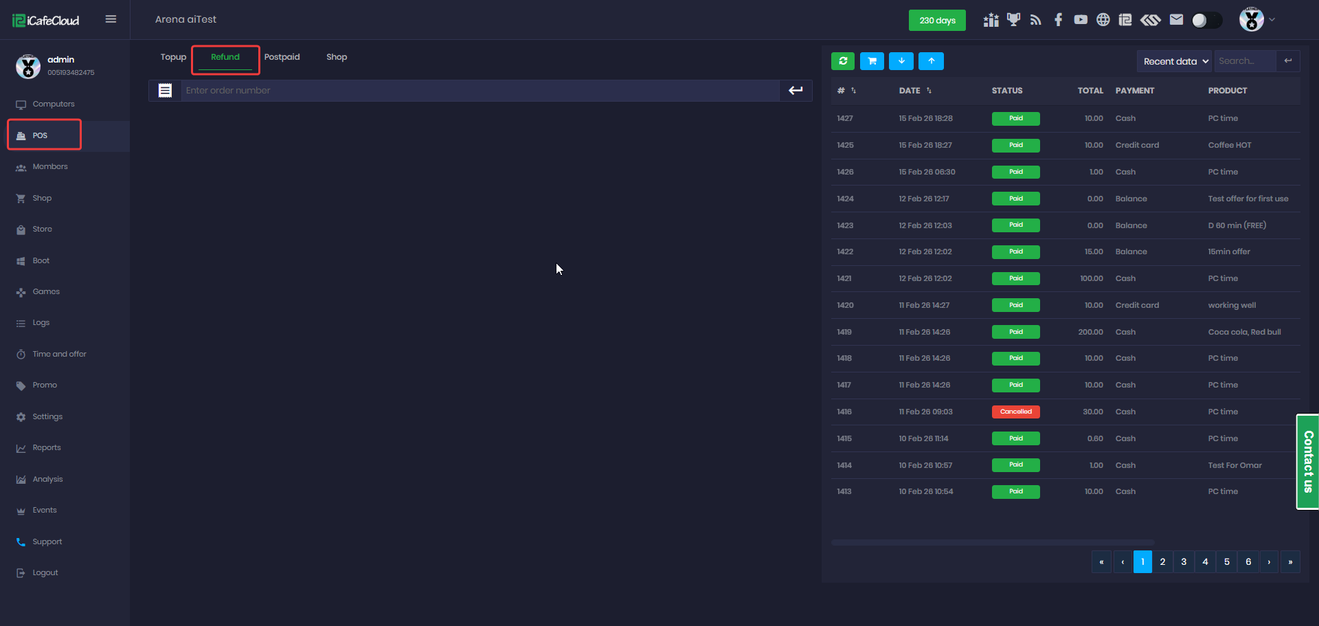 The following explains how to refund an order in the POS page by searching for its order number in the list.