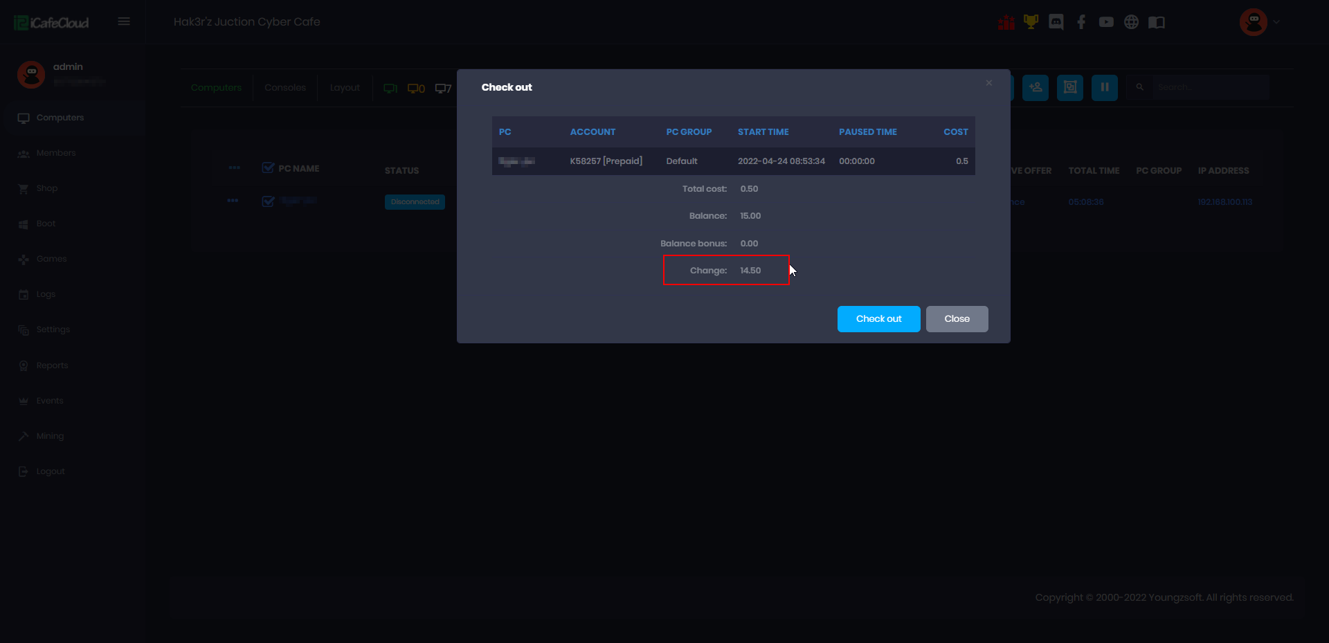 - if you choose “Return change” then when the session ends or checkout the “Change” amount will display the remaining amount after total cost is deducted from balance (Figure 3).