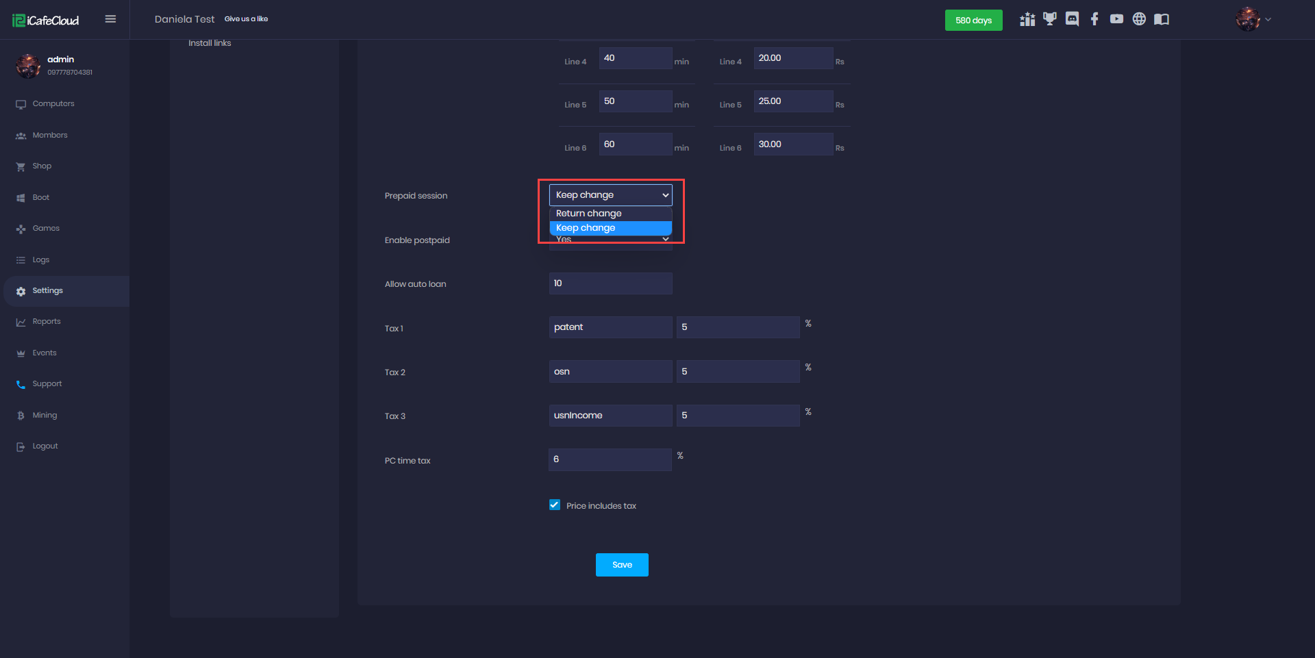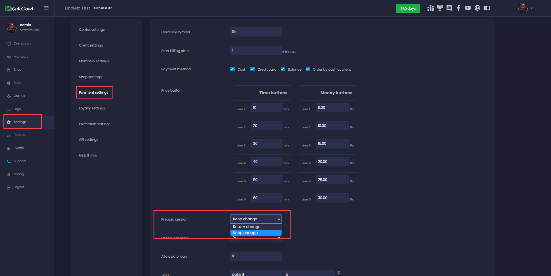 - Click on the “Settings” option from the sidebar and then click on the “Payment settings”and scroll down to find “Prepaid session” (Figure 1).