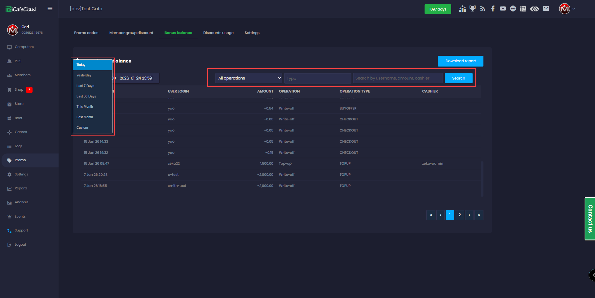 - You can choose to display operations by date or operation type, and search by amount, username, or cashier. Click Search to view the selected details. (Figure 2)
