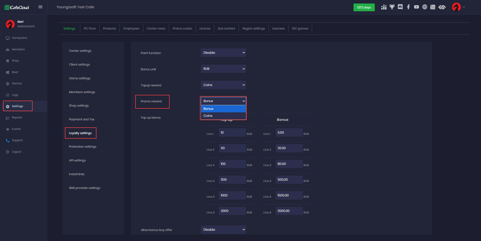 - Navigate to Settings > Loyalty Settings, where you'll find the Promo Reward option. Next to it, you can choose to reward users with either Bonus Time or Coins. (Figure 1)