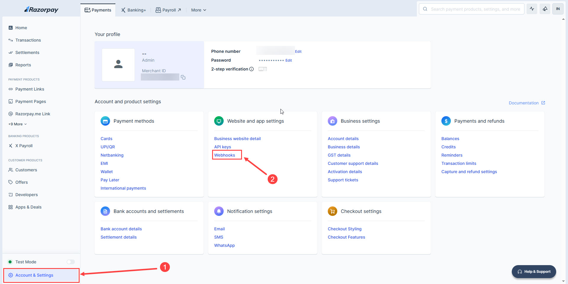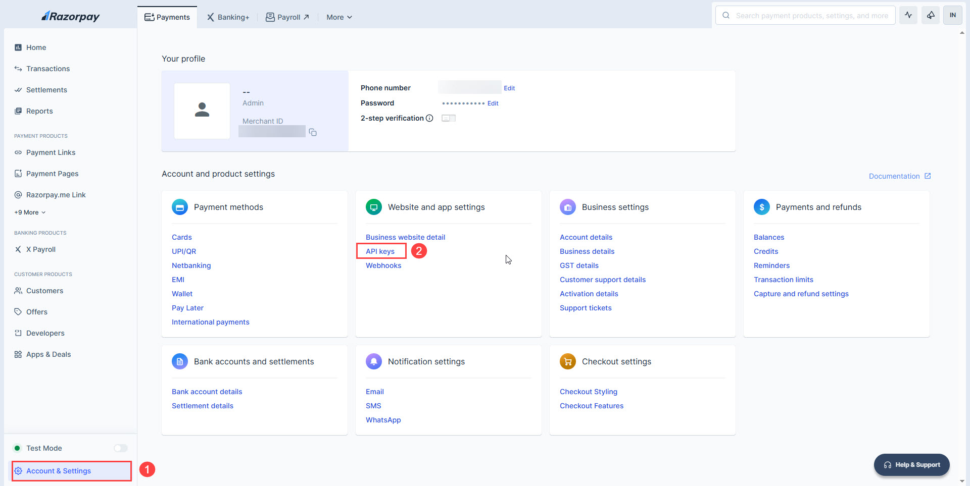 - Log in to the Razorpay website with your credentials, scroll to the bottom of the page, and click on "Account & Settings", then select API keys (Figure 1)
