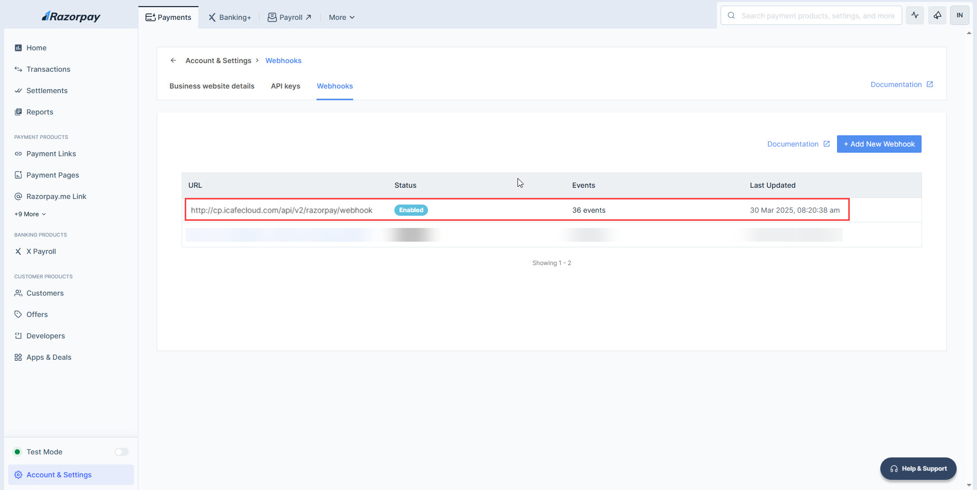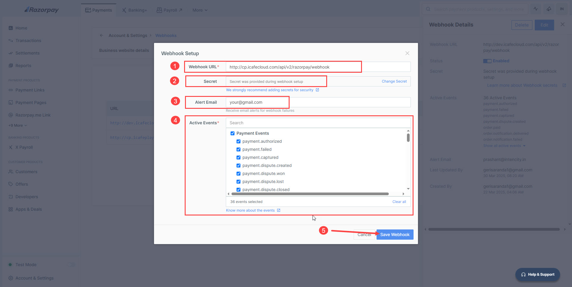 - Copy and paste the following link into the webhook URL field: http://cp.icafecloud.com/api/v2/razorpay/webhook