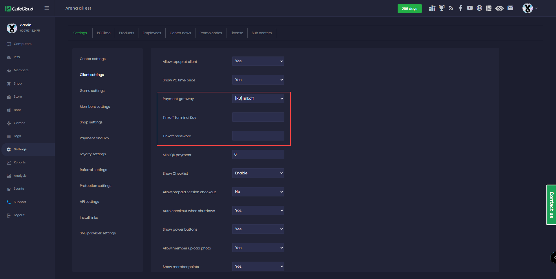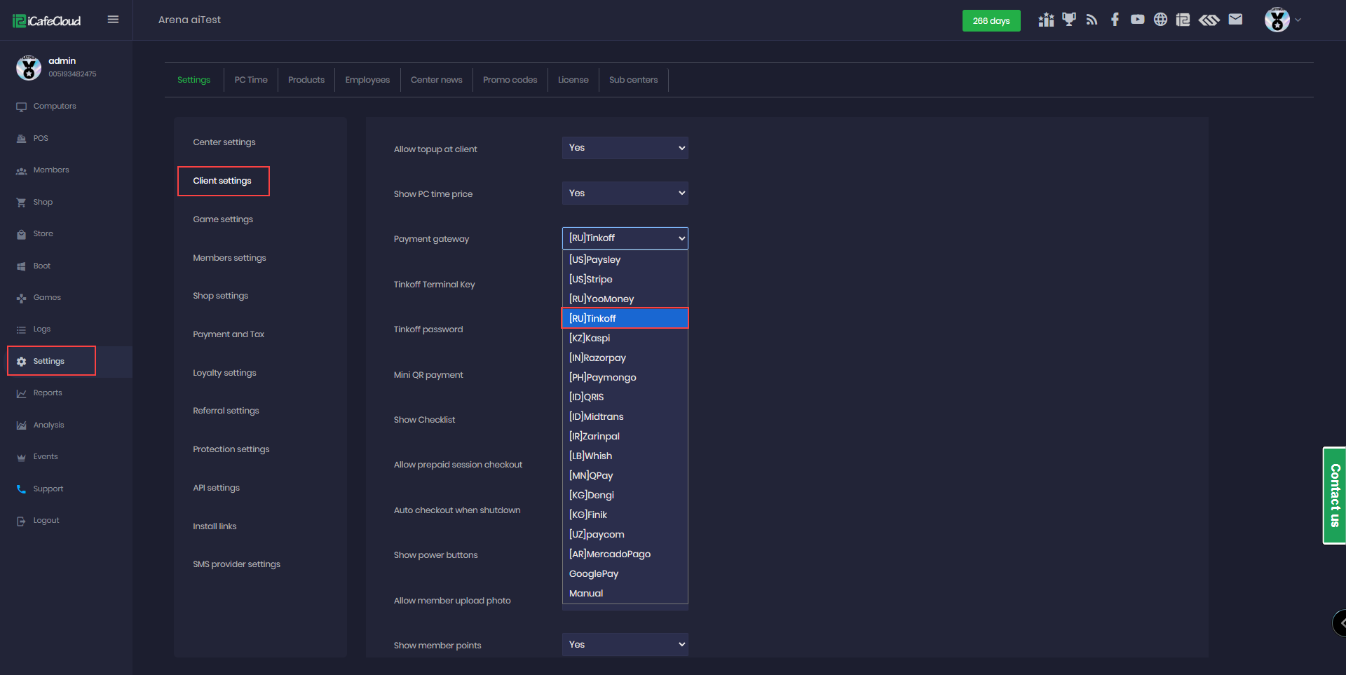 - In the iCafeCloud admin panel, go to Settings → Client Settings, find Allow Top-up at Client, set it to Enabled, and then select Tinkoff under Payment Gateways. (Figure 1)